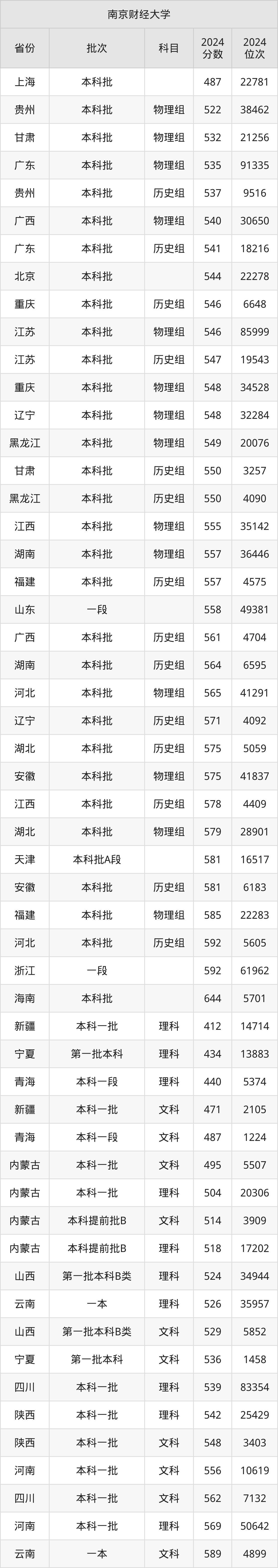 在上海本科批,南京财经大学的最低分是487、最低录取位次是22781名。在贵州本科批物理组,南京财经大学的最低分是522、最低录取位次是38462名。