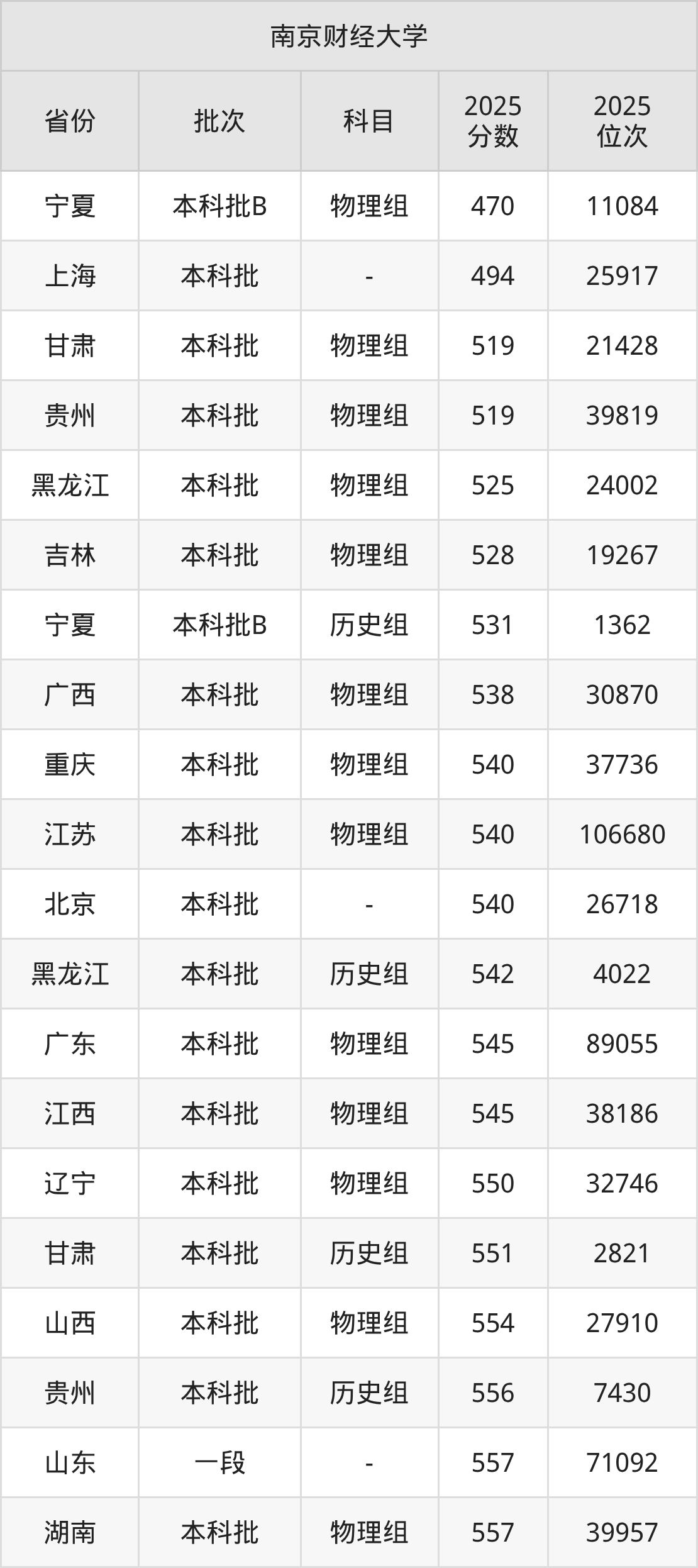 在宁夏本科批B物理组,南京财经大学的最低分是470、最低录取位次是11084名。在上海本科批,南京财经大学的最低分是494、最低录取位次是25917名。