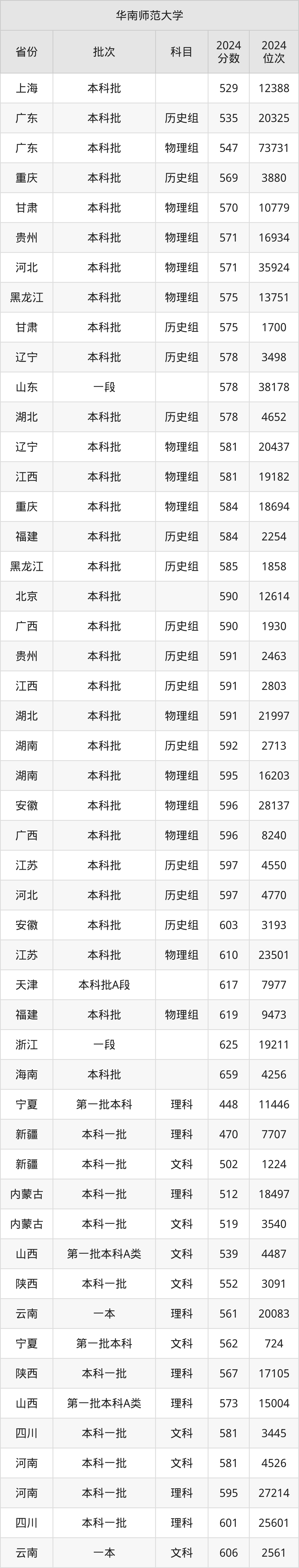 在上海本科批,华南师范大学的最低分是529、最低录取位次是12388名。在广东本科批历史组,华南师范大学的最低分是535、最低录取位次是20325名。