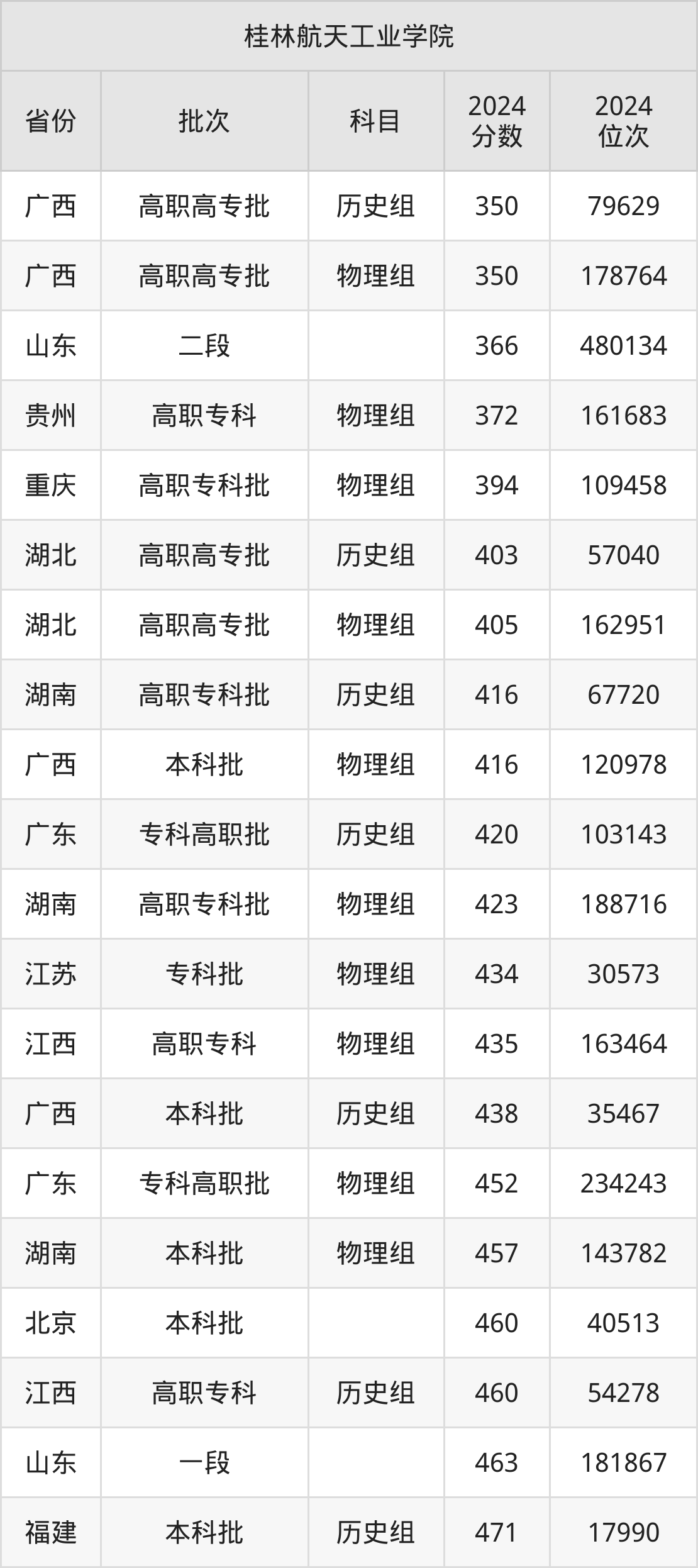 在广西高职高专批历史组,桂林航天工业学院的最低分是350、最低录取位次是79629名。在山东二段,桂林航天工业学院的最低分是366、最低录取位次是480134名。
