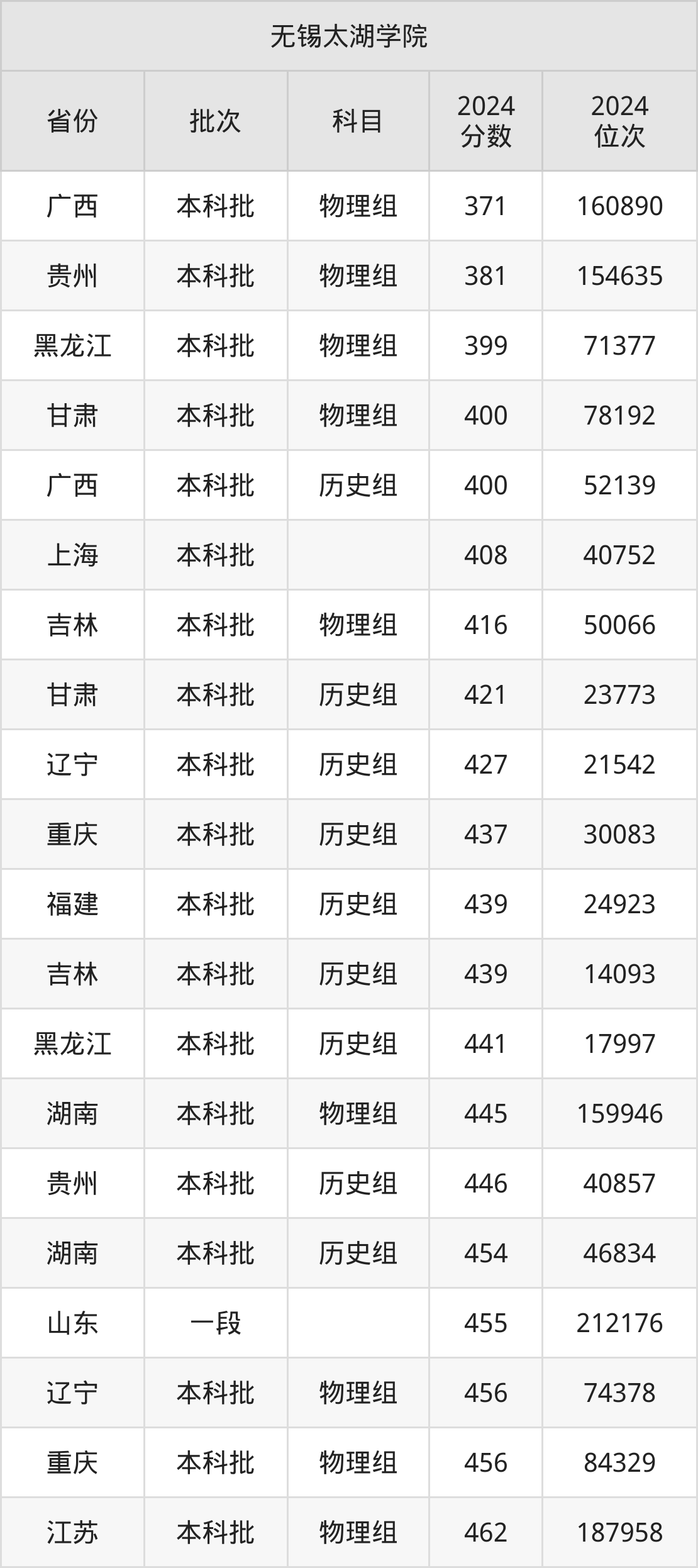 在广西本科批物理组,无锡太湖学院的最低分是371、最低录取位次是160890名。在贵州本科批物理组,无锡太湖学院的最低分是381、最低录取位次是154635名。