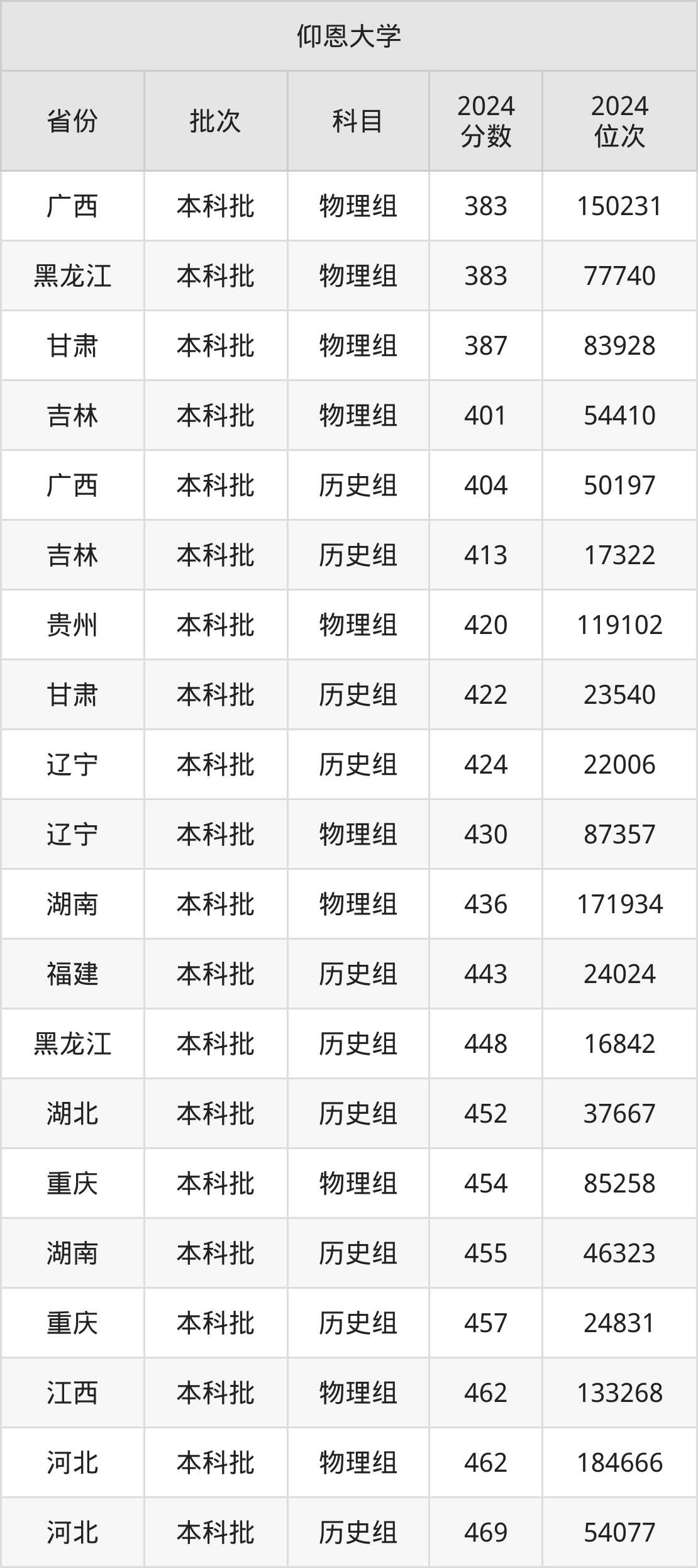 在广西本科批物理组,仰恩大学的最低分是383、最低录取位次是150231名。在黑龙江本科批物理组,仰恩大学的最低分是383、最低录取位次是77740名。