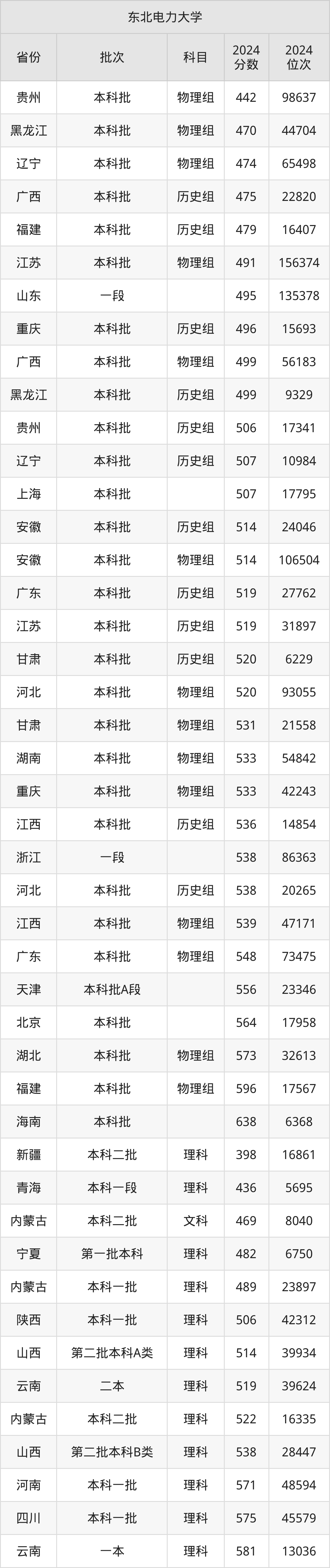 在贵州本科批物理组,东北电力大学的最低分是442、最低录取位次是98637名。在黑龙江本科批物理组,东北电力大学的最低分是470、最低录取位次是44704名。