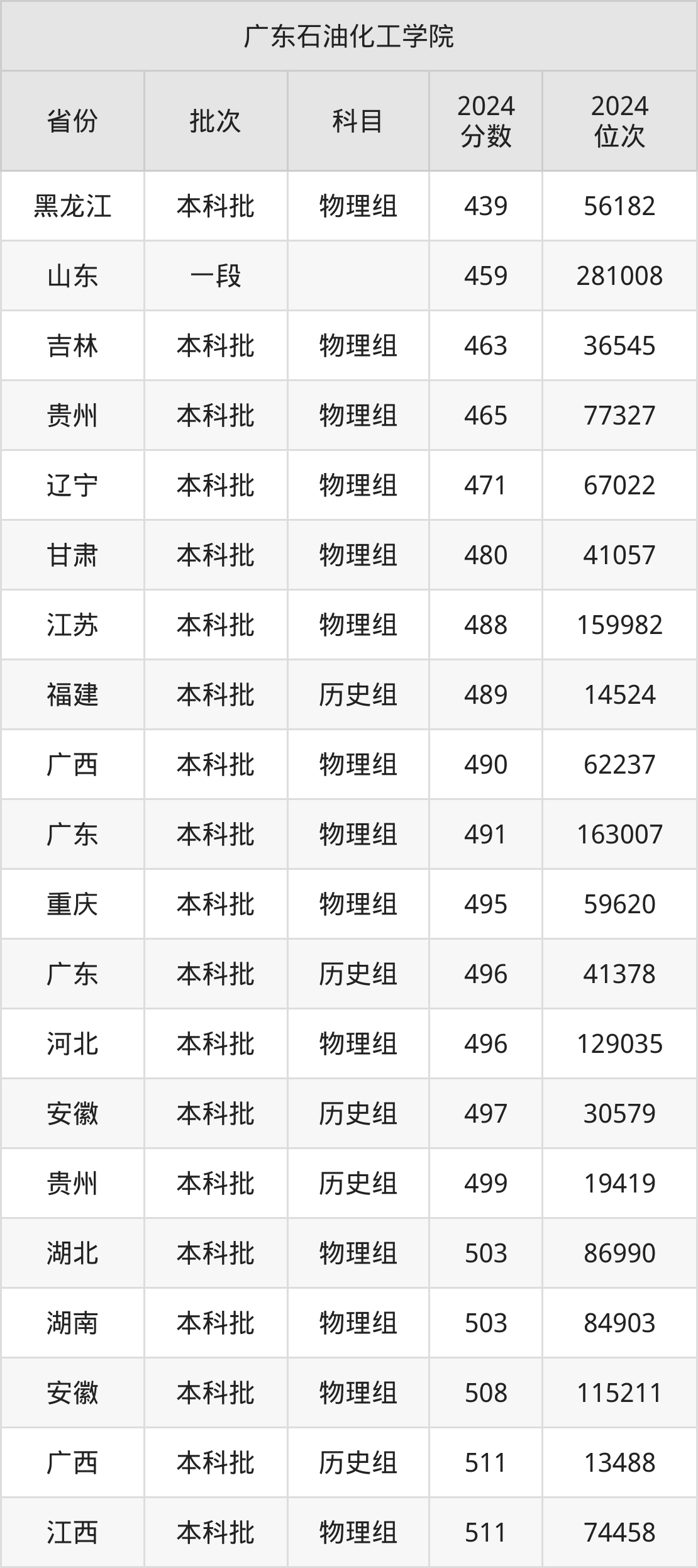在黑龙江本科批物理组,广东石油化工学院的最低分是439、最低录取位次是56182名。在山东一段,广东石油化工学院的最低分是459、最低录取位次是281008名。