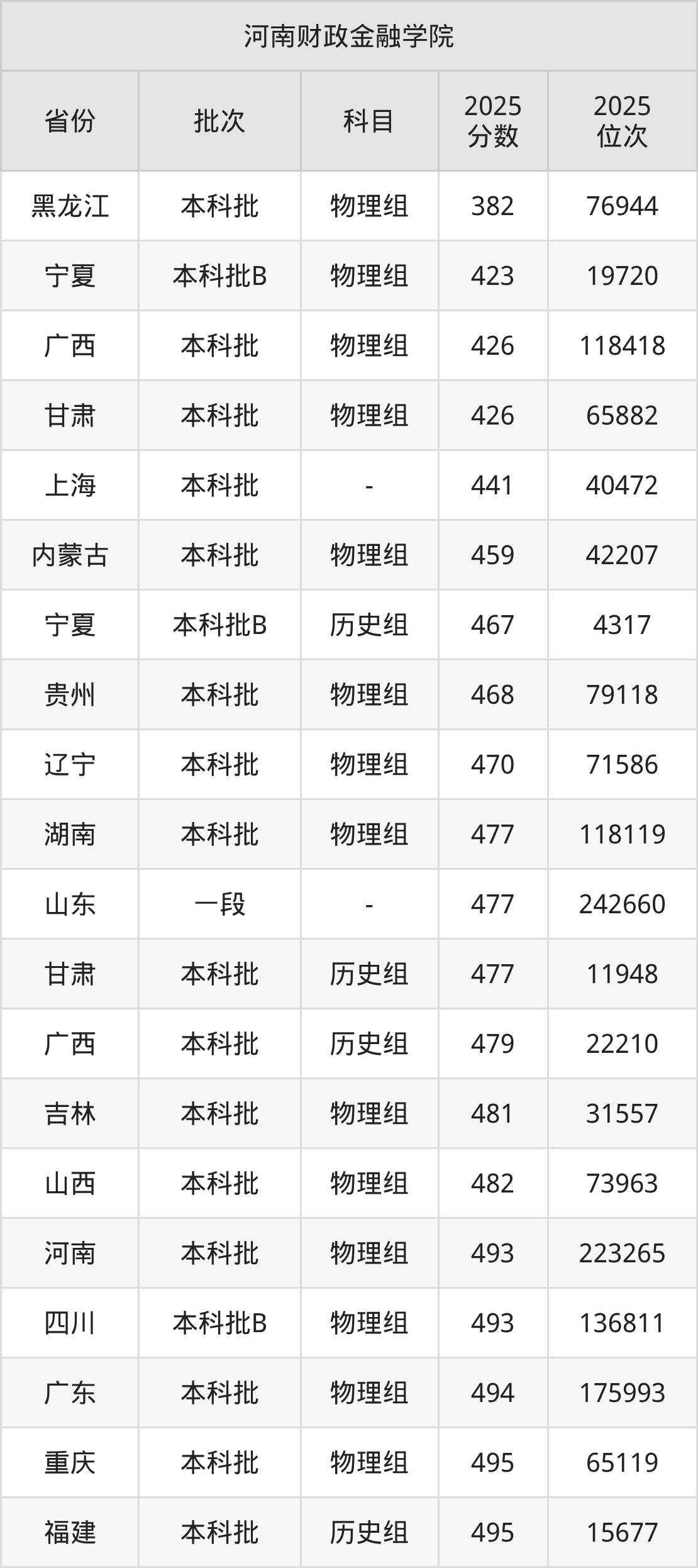 在黑龙江本科批物理组,河南财政金融学院的最低分是382、最低录取位次是76944名。在宁夏本科批B物理组,河南财政金融学院的最低分是423、最低录取位次是19720名。