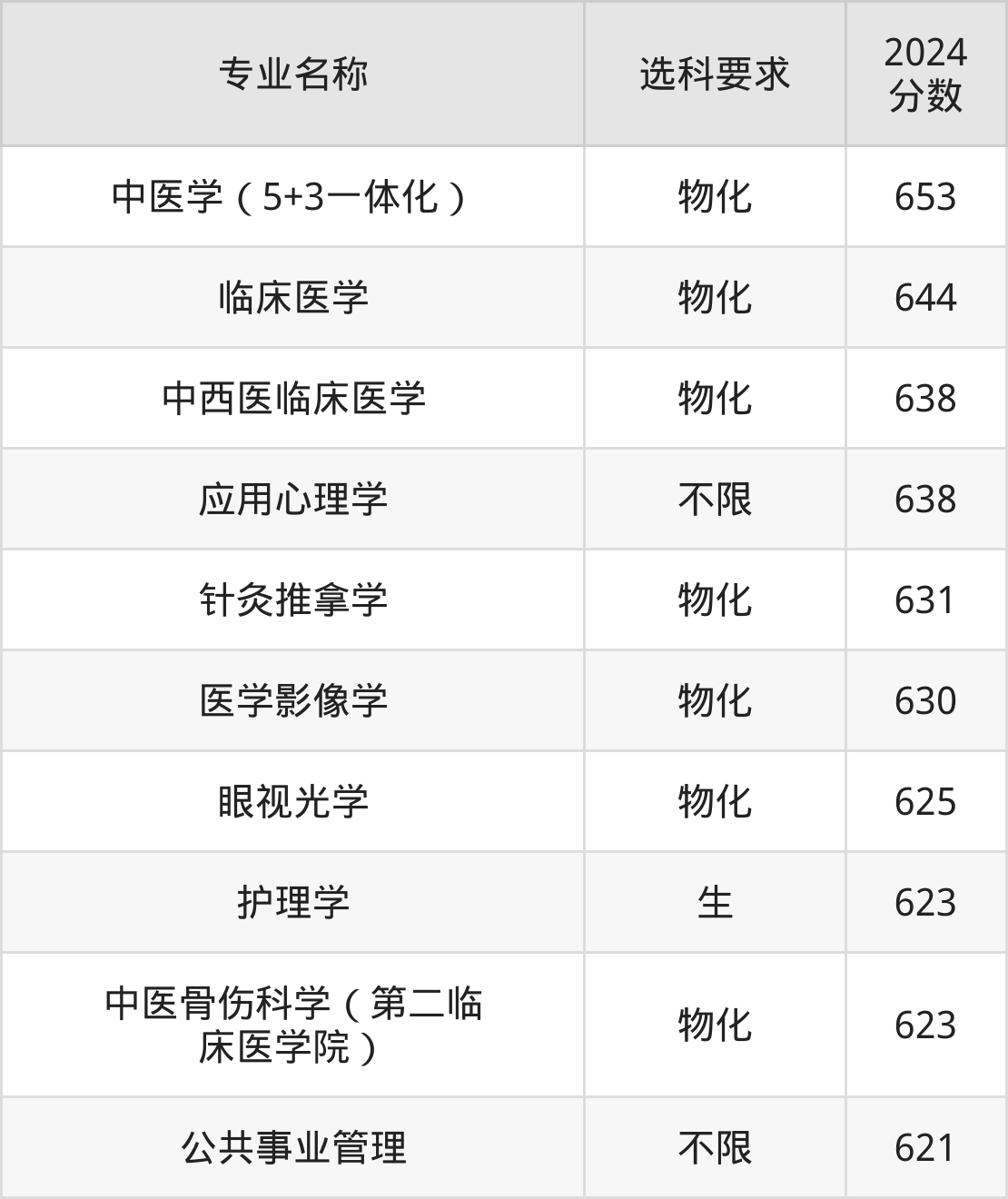 对于浙江高三学生而言,广州中医药大学热门专业是:中医学、临床医学、中西医临床医学、应用心理学、针灸推拿学、医学影像学、眼视光学、护理学、中医骨伤科学、公共事业管理,2024年在浙江的最低分是621至653。
