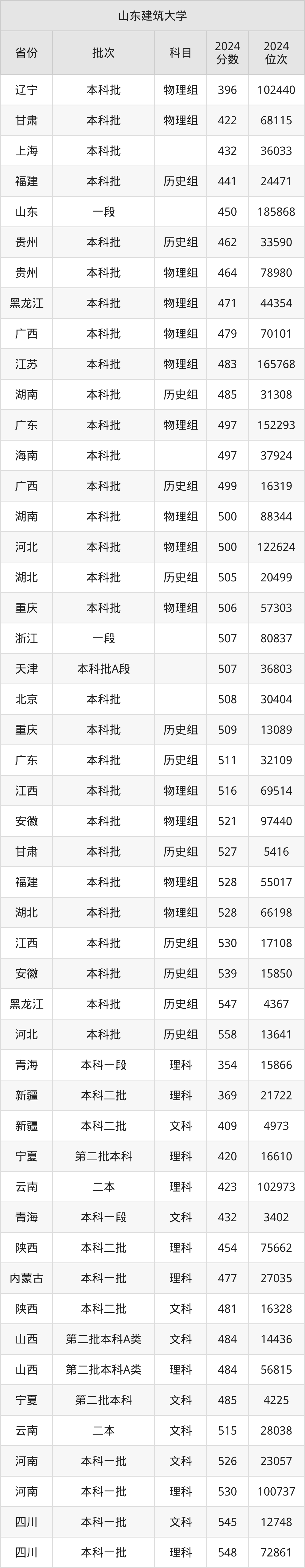 在辽宁本科批物理组,山东建筑大学的最低分是396、最低录取位次是102440名。在甘肃本科批物理组,山东建筑大学的最低分是422、最低录取位次是68115名。