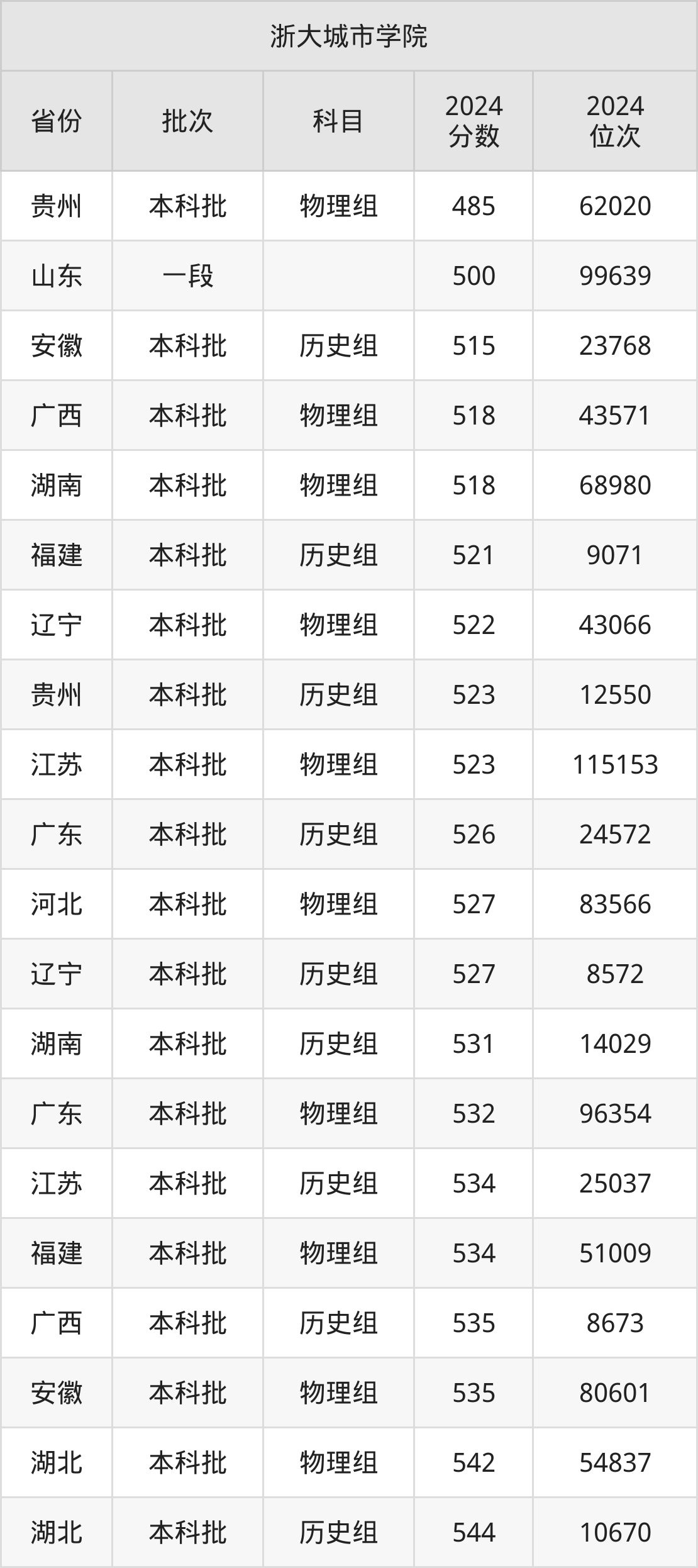 在贵州本科批物理组,浙大城市学院的最低分是485、最低录取位次是62020名。在山东一段,浙大城市学院的最低分是500、最低录取位次是99639名。