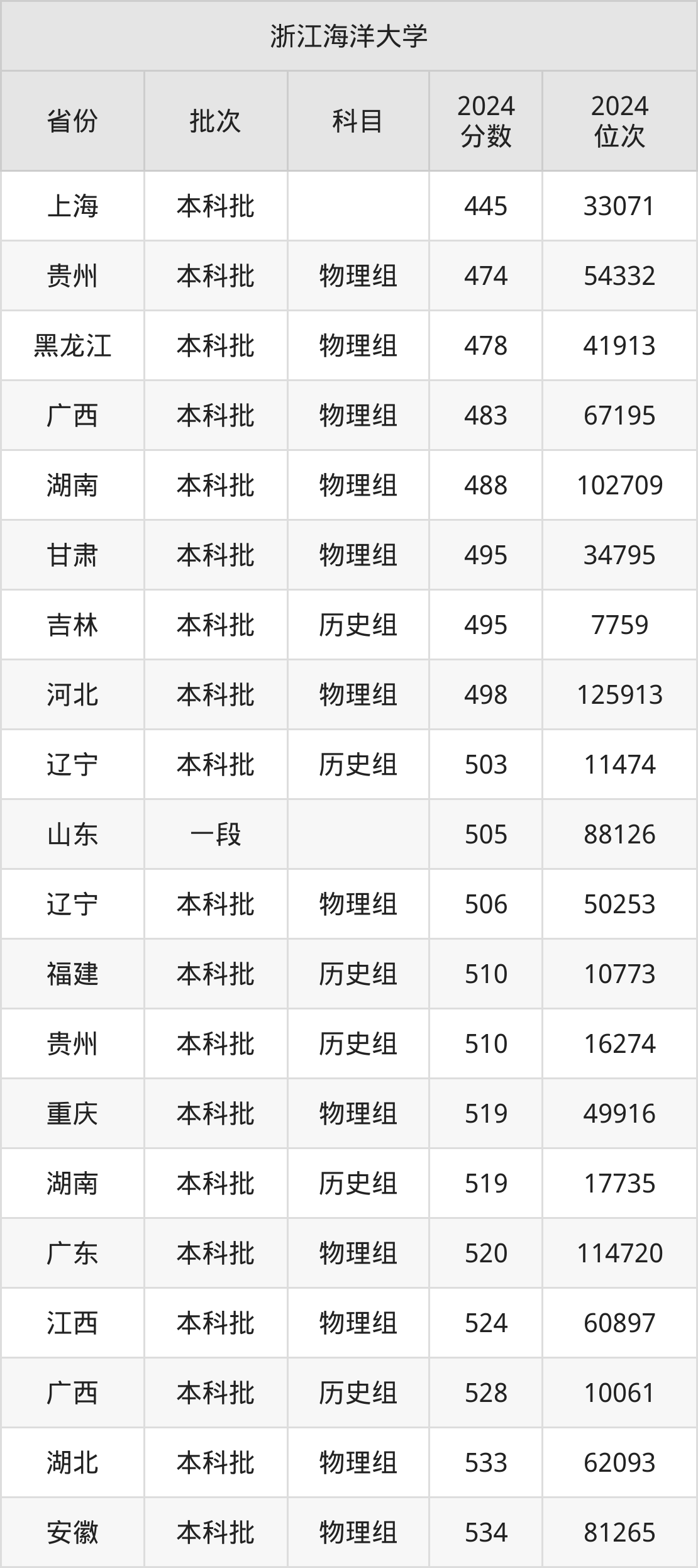 在上海本科批,浙江海洋大学的最低分是445、最低录取位次是33071名。在贵州本科批物理组,浙江海洋大学的最低分是474、最低录取位次是54332名。