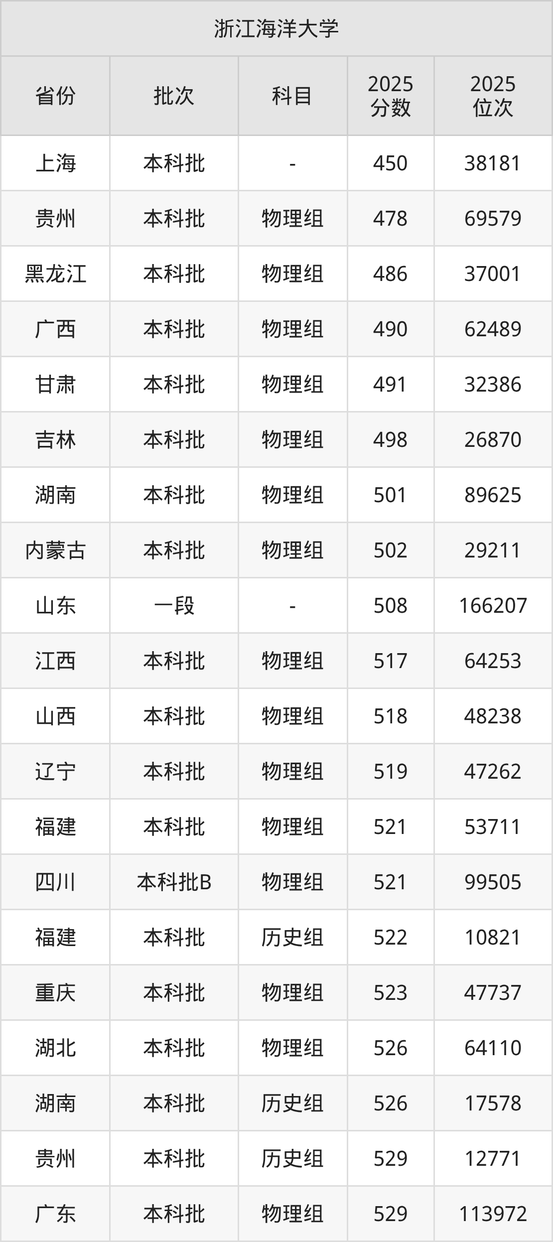 在上海本科批,浙江海洋大学的最低分是450、最低录取位次是38181名。在贵州本科批物理组,浙江海洋大学的最低分是478、最低录取位次是69579名。