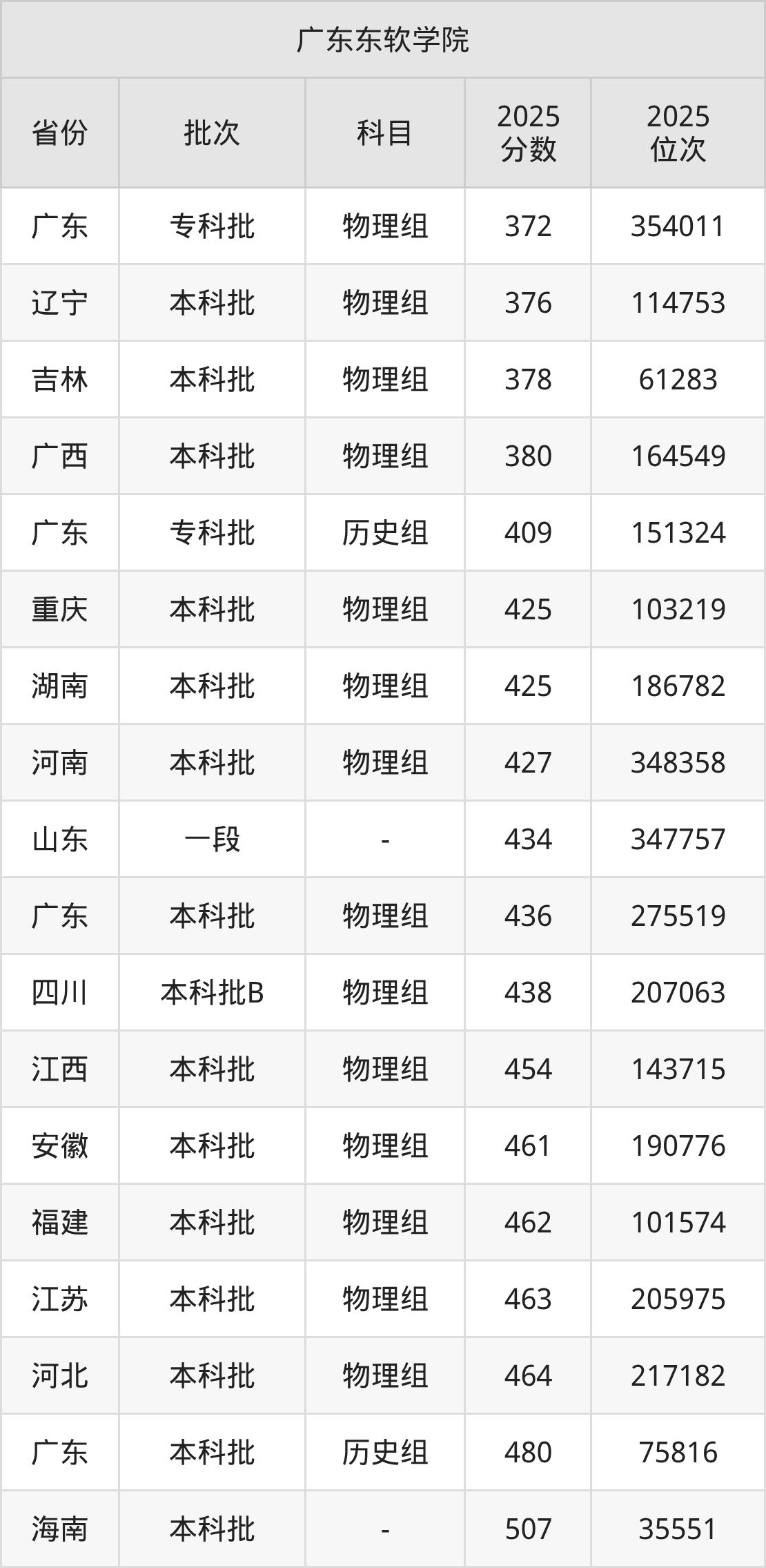 在广东专科批物理组,广东东软学院的最低分是372、最低录取位次是354011名。在辽宁本科批物理组,广东东软学院的最低分是376、最低录取位次是114753名。
