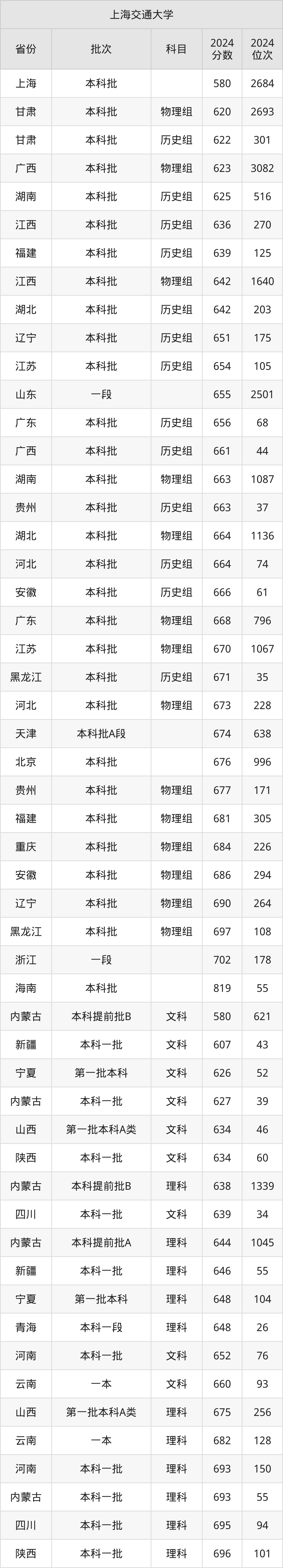 在上海本科批,上海交通大学的最低分是580、最低录取位次是2684名。在甘肃本科批物理组,上海交通大学的最低分是620、最低录取位次是2693名。
