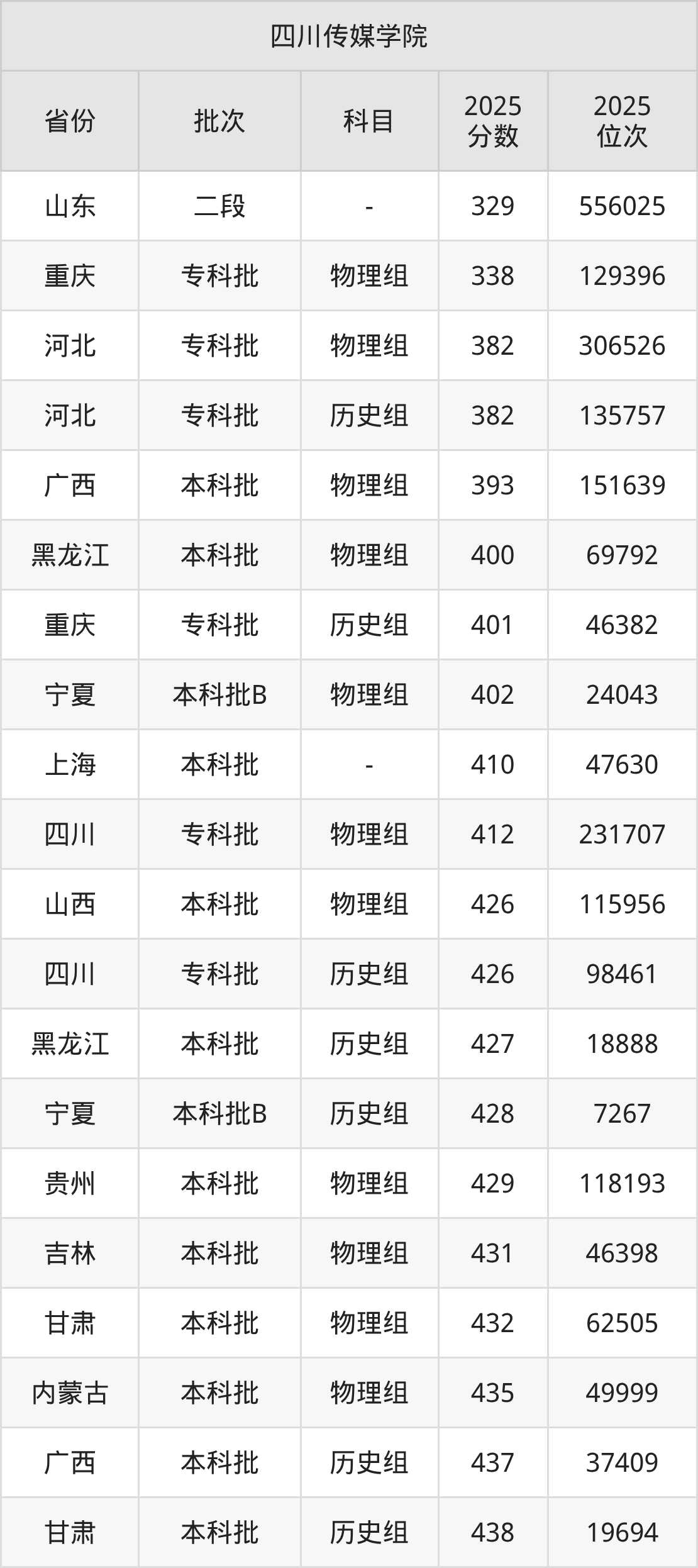在山东二段,四川传媒学院的最低分是329、最低录取位次是556025名。在重庆专科批物理组,四川传媒学院的最低分是338、最低录取位次是129396名。