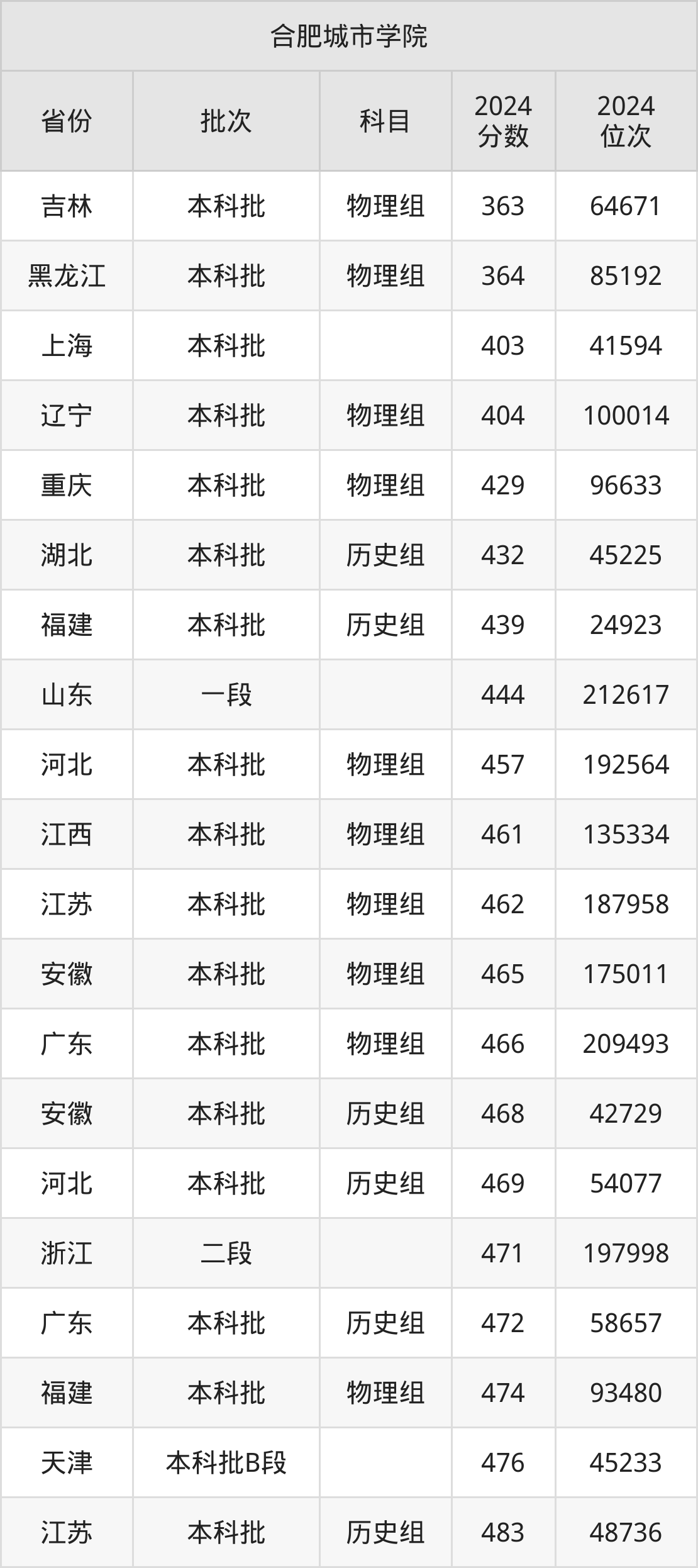 在吉林本科批物理组,合肥城市学院的最低分是363、最低录取位次是64671名。在黑龙江本科批物理组,合肥城市学院的最低分是364、最低录取位次是85192名。