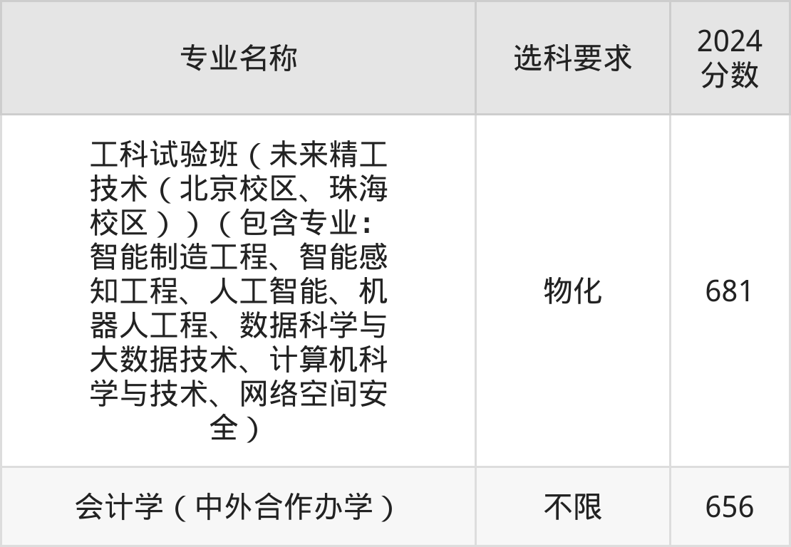 | 工科试验班(未来精工 技术)(包含专业:智 能制造工程、智能感知 工程、人工智能、机器 人工程、数据科学与大 数据技术、计算机科学 与技术、网络空间安全) | 物化 | 671 |