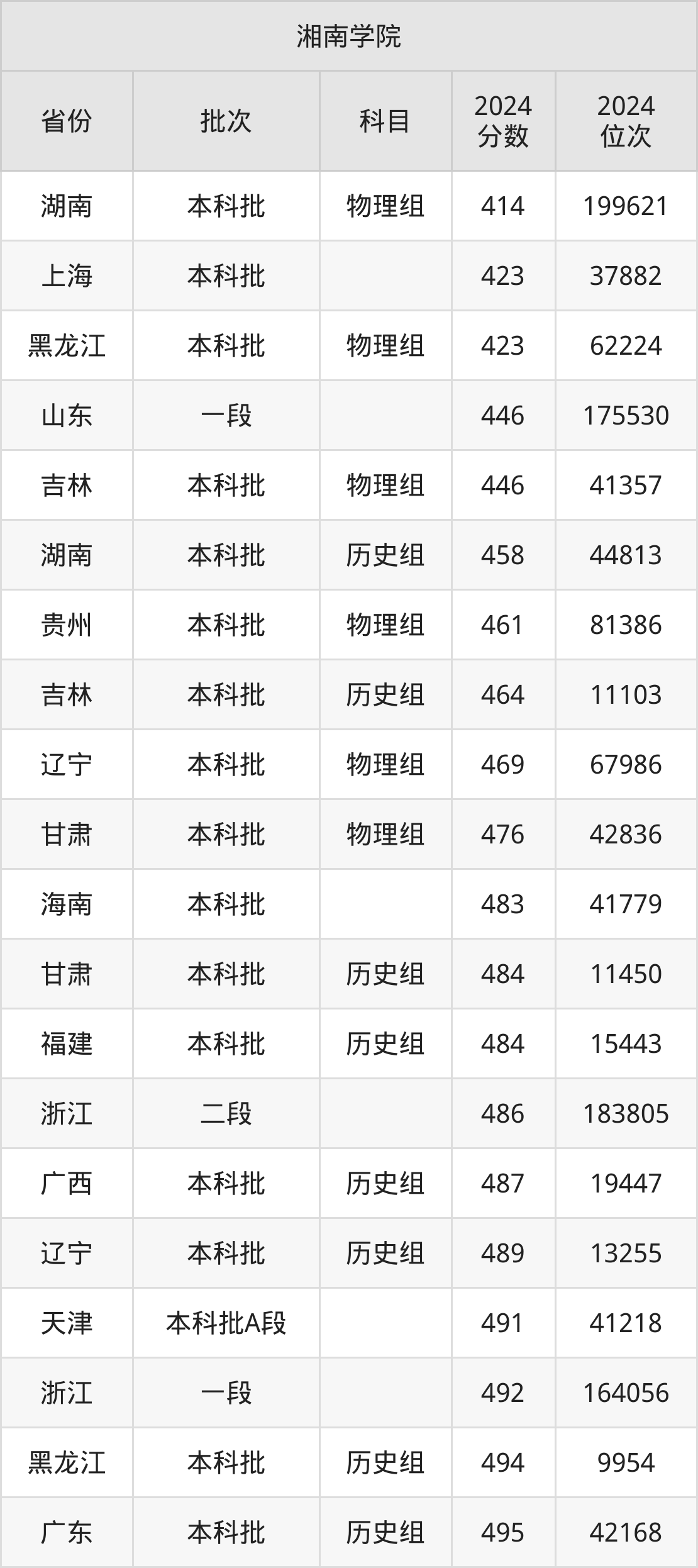 在湖南本科批物理组,湘南学院的最低分是414、最低录取位次是199621名。在上海本科批,湘南学院的最低分是423、最低录取位次是37882名。