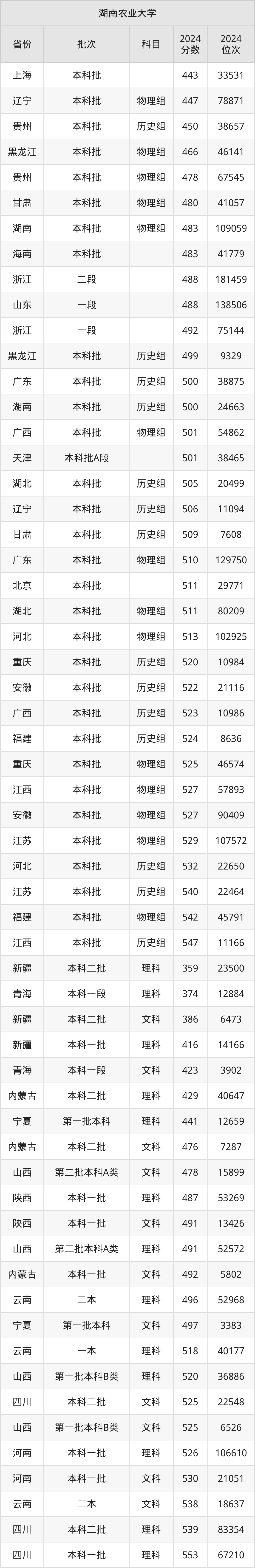 圆梦小编为2025届想要报考湖南农业大学的同学整理了:湖南农业大学2024年在全国29个省的最低分及录取位次。