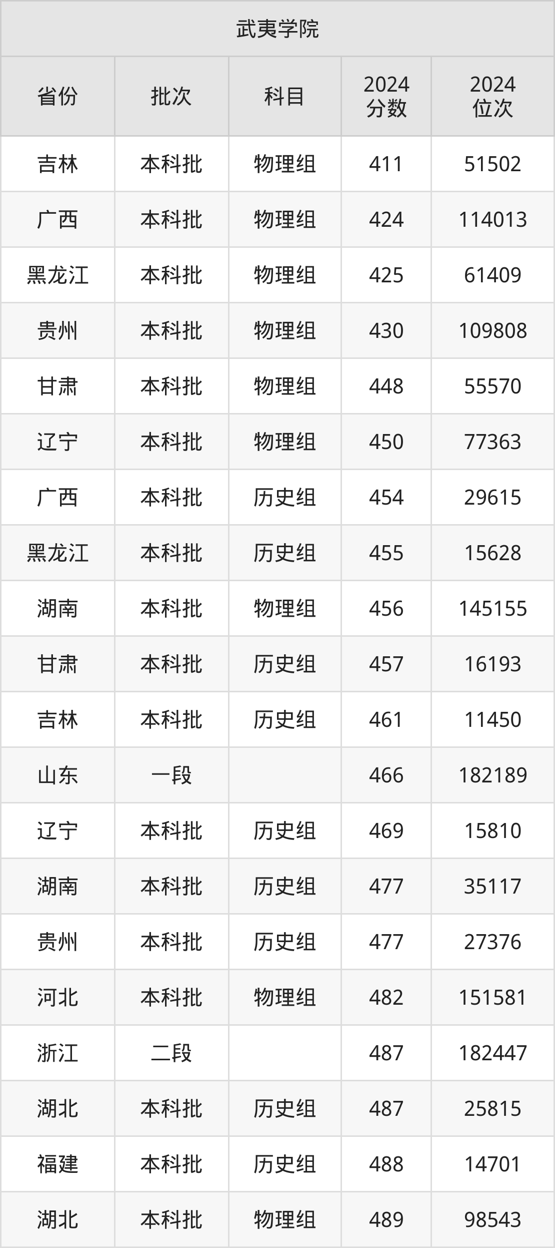 在吉林本科批物理组,武夷学院的最低分是411、最低录取位次是51502名。在广西本科批物理组,武夷学院的最低分是424、最低录取位次是114013名。