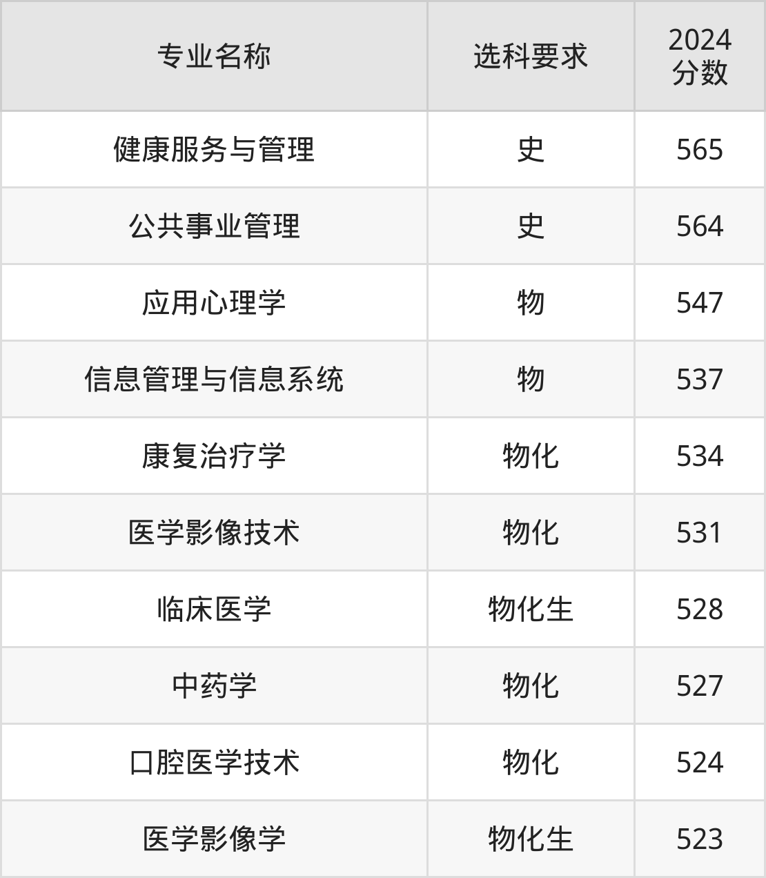 对于浙江高三学生而言,吉林医药学院热门专业是:健康服务与管理、公共事业管理、应用心理学、信息管理与信息系统、康复治疗学、医学影像技术、临床医学、中药学、口腔医学技术、医学影像学,2024年在浙江的最低分是523至565。