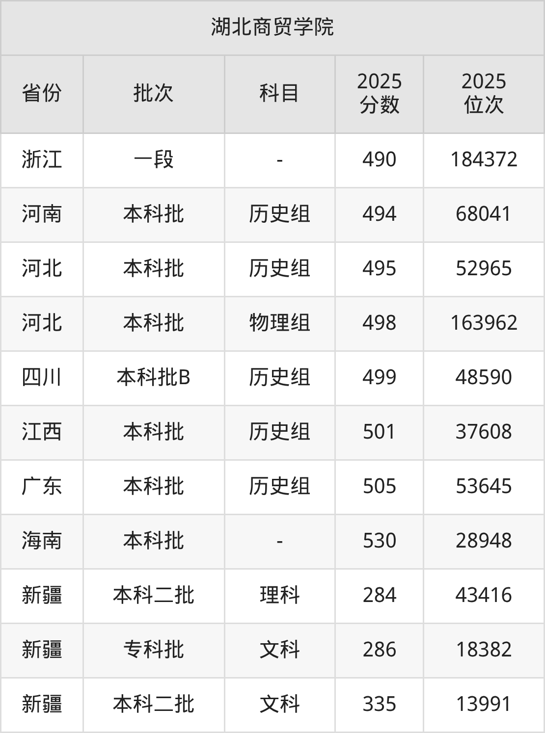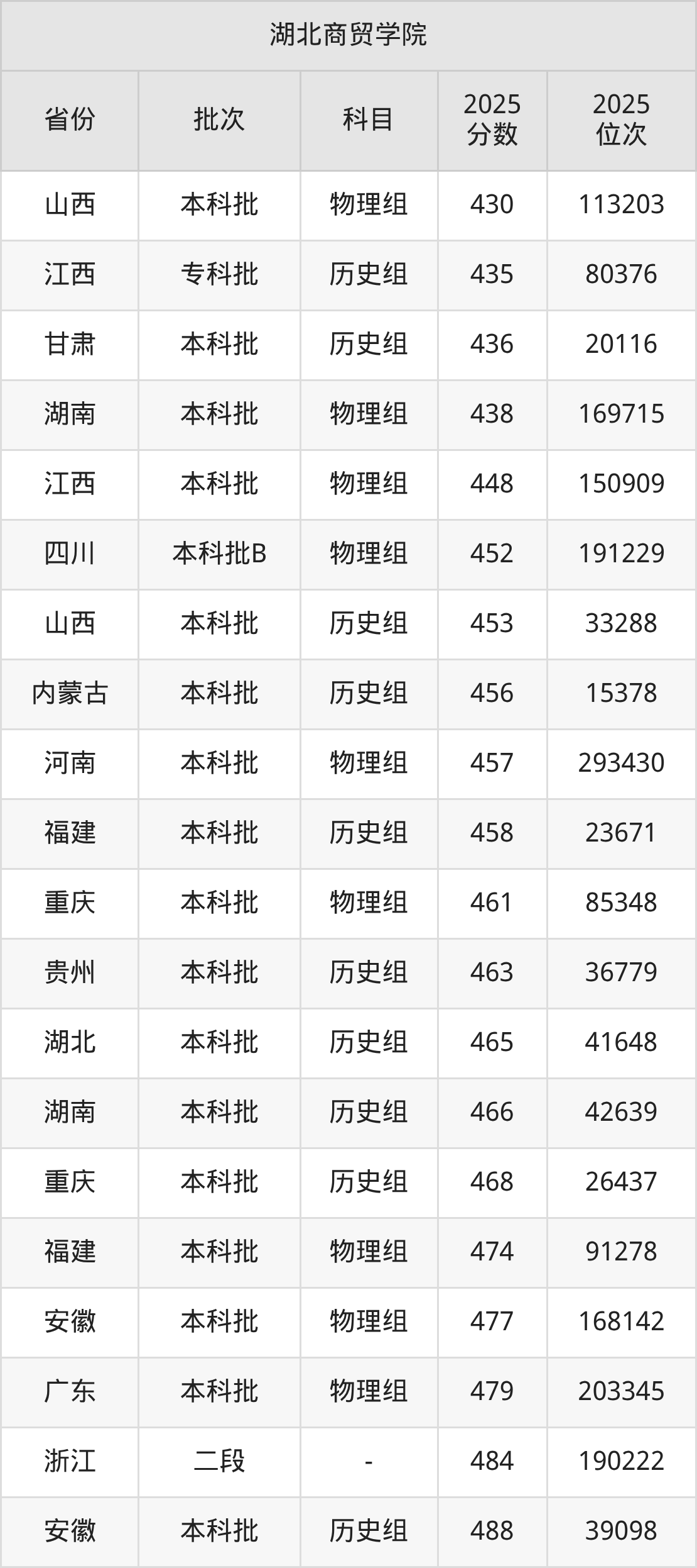 圆梦小编为2026届想要报考湖北商贸学院的同学整理了:湖北商贸学院2025年在全国20个省的最低分及录取位次。