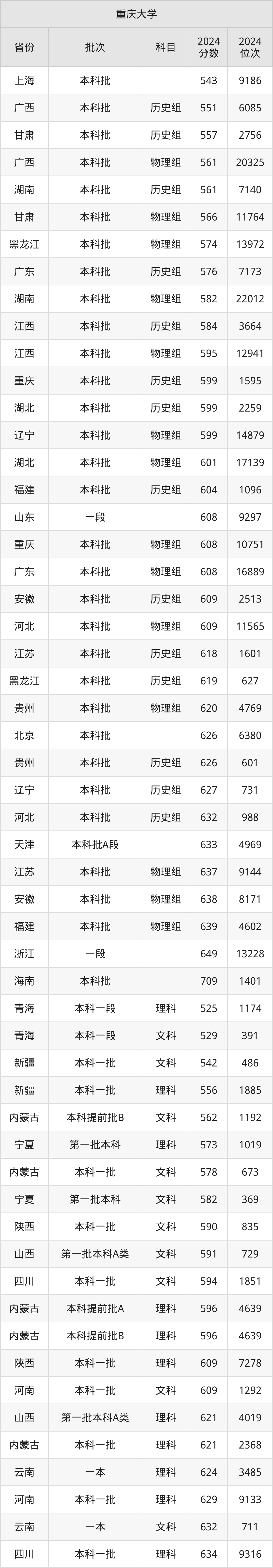 在上海本科批,重庆大学的最低分是543、最低录取位次是9186名。在广西本科批历史组,重庆大学的最低分是551、最低录取位次是6085名。