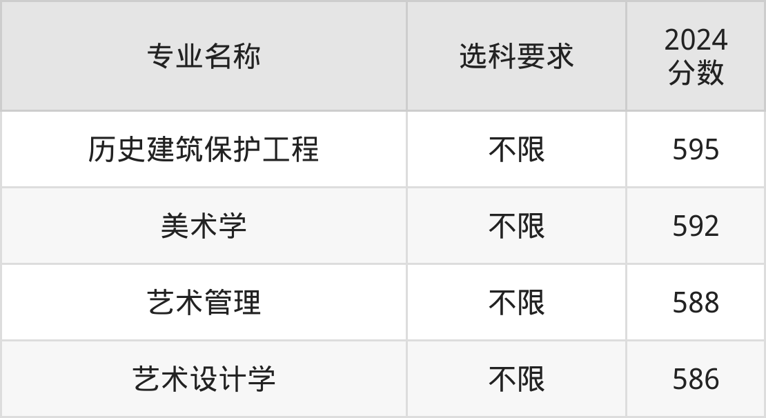 对于浙江高三学生而言,天津美术学院热门专业是:历史建筑保护工程、美术学、艺术管理、艺术设计学,2024年在浙江的最低分是586至595。