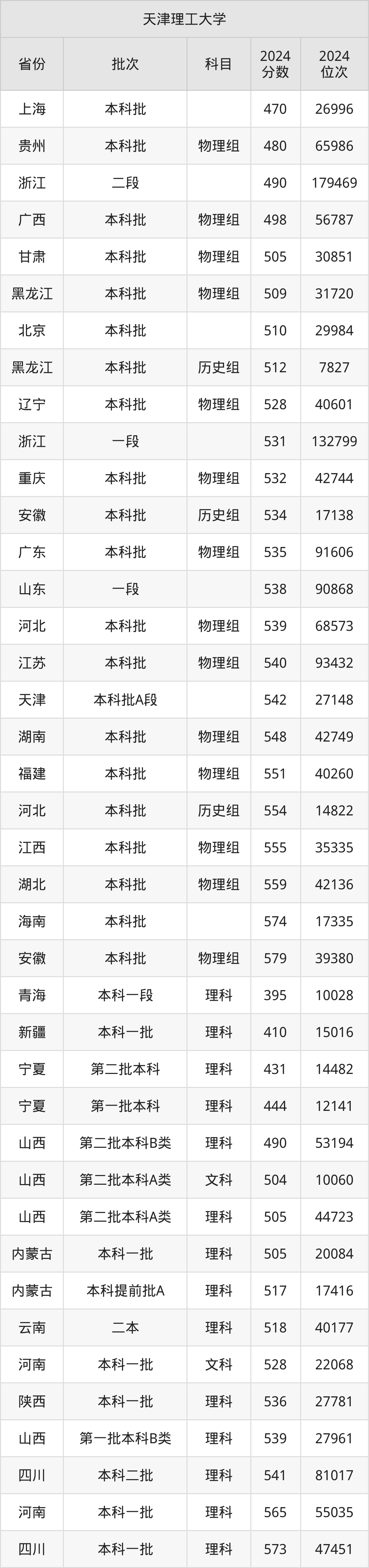 在上海本科批,天津理工大学的最低分是470、最低录取位次是26996名。在贵州本科批物理组,天津理工大学的最低分是480、最低录取位次是65986名。