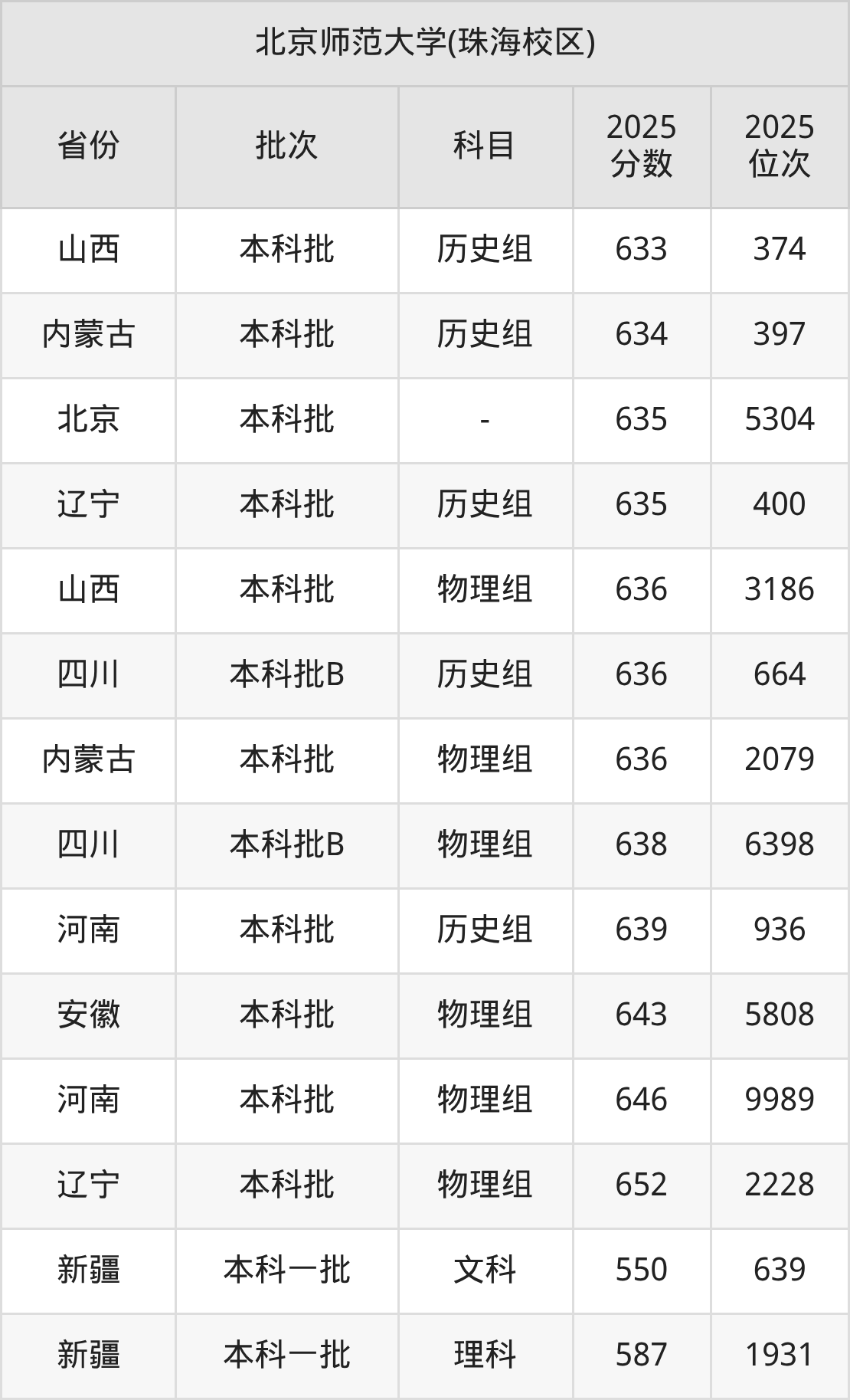 二、北京师范大学(珠海校区)2025年录取分数线汇总