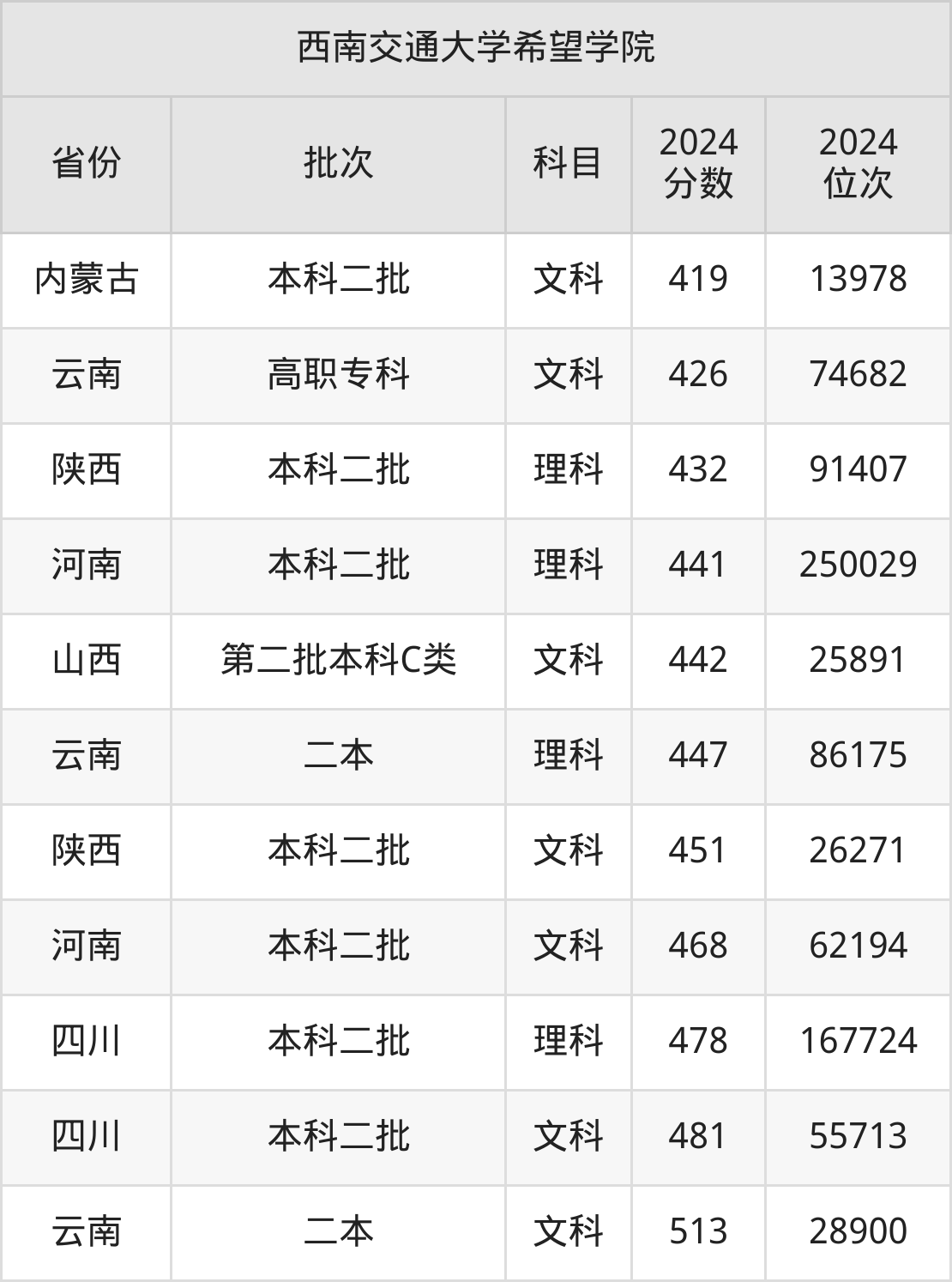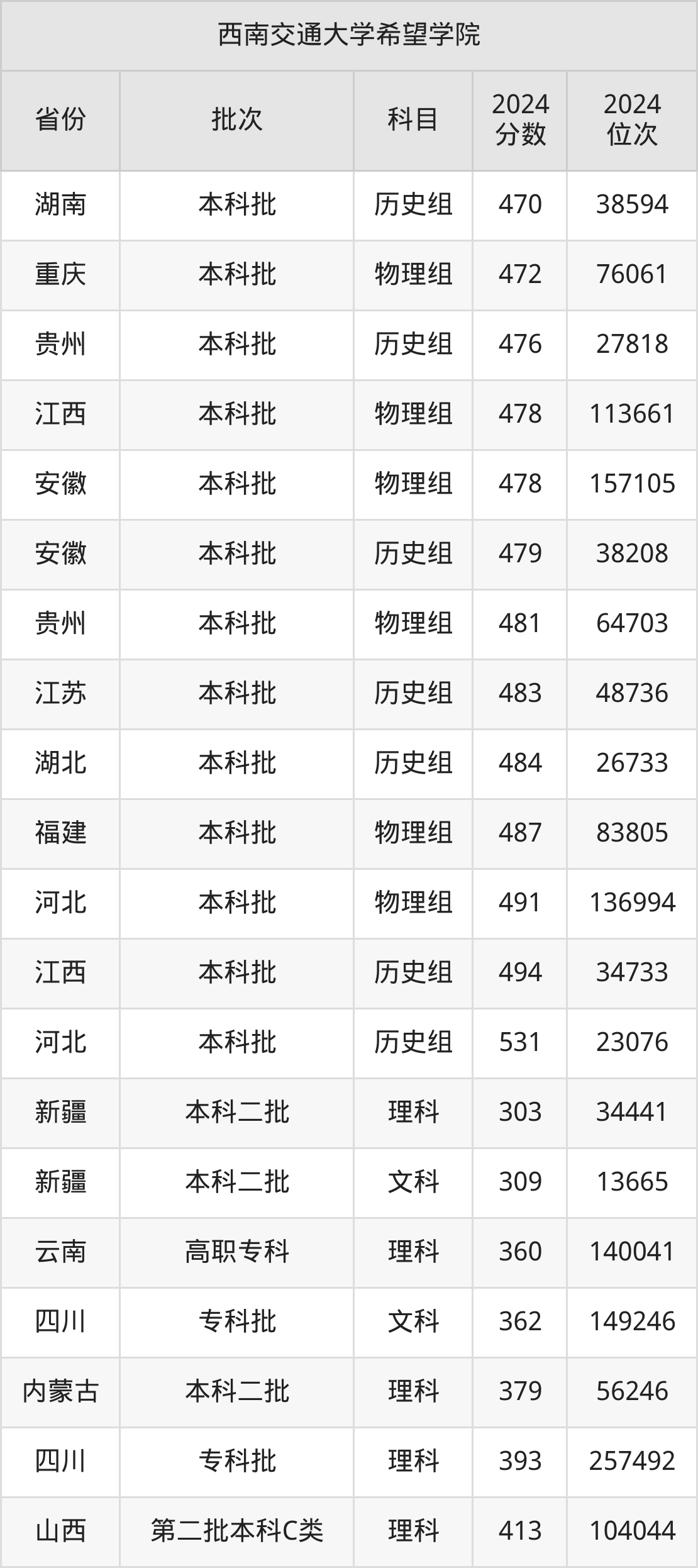 二、西南交通大学希望学院2024年录取分数线汇总