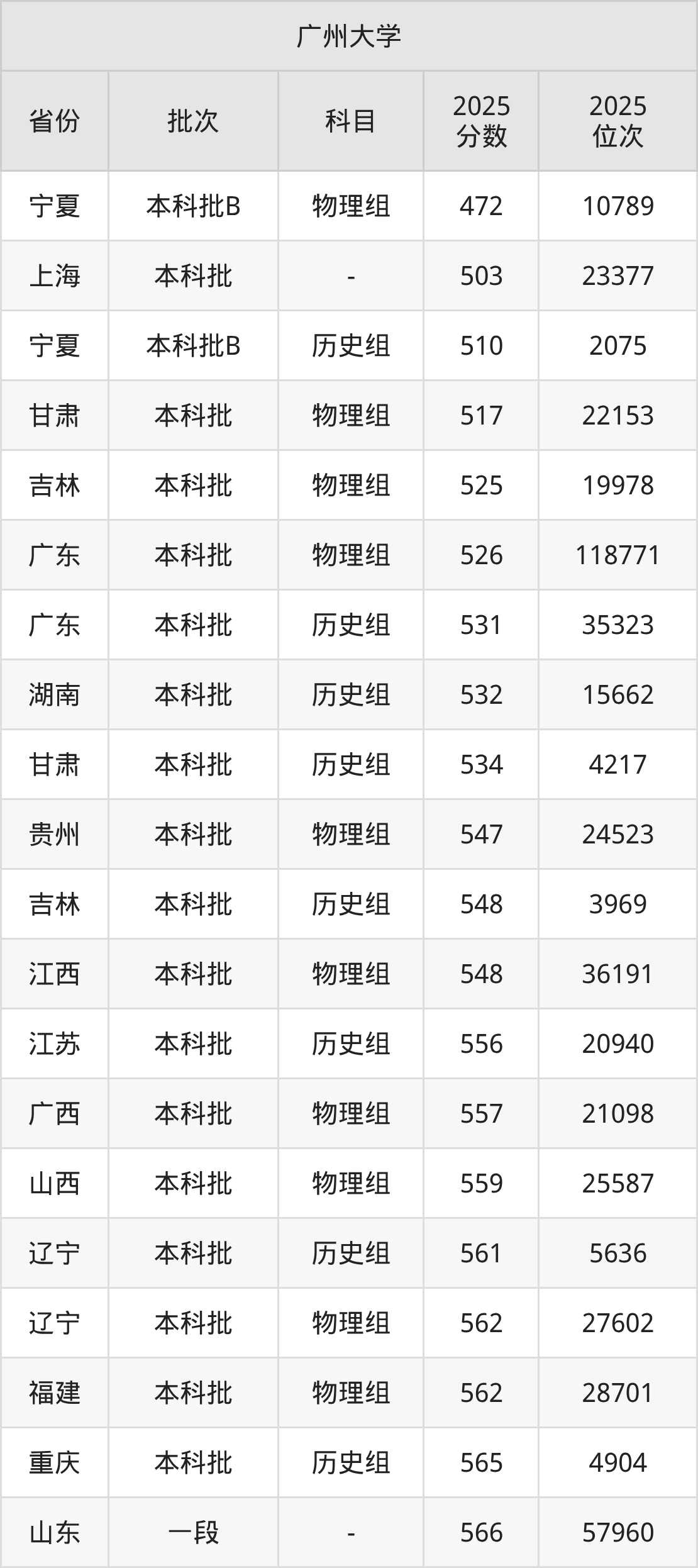 在宁夏本科批B物理组,广州大学的最低分是472、最低录取位次是10789名。在上海本科批,广州大学的最低分是503、最低录取位次是23377名。