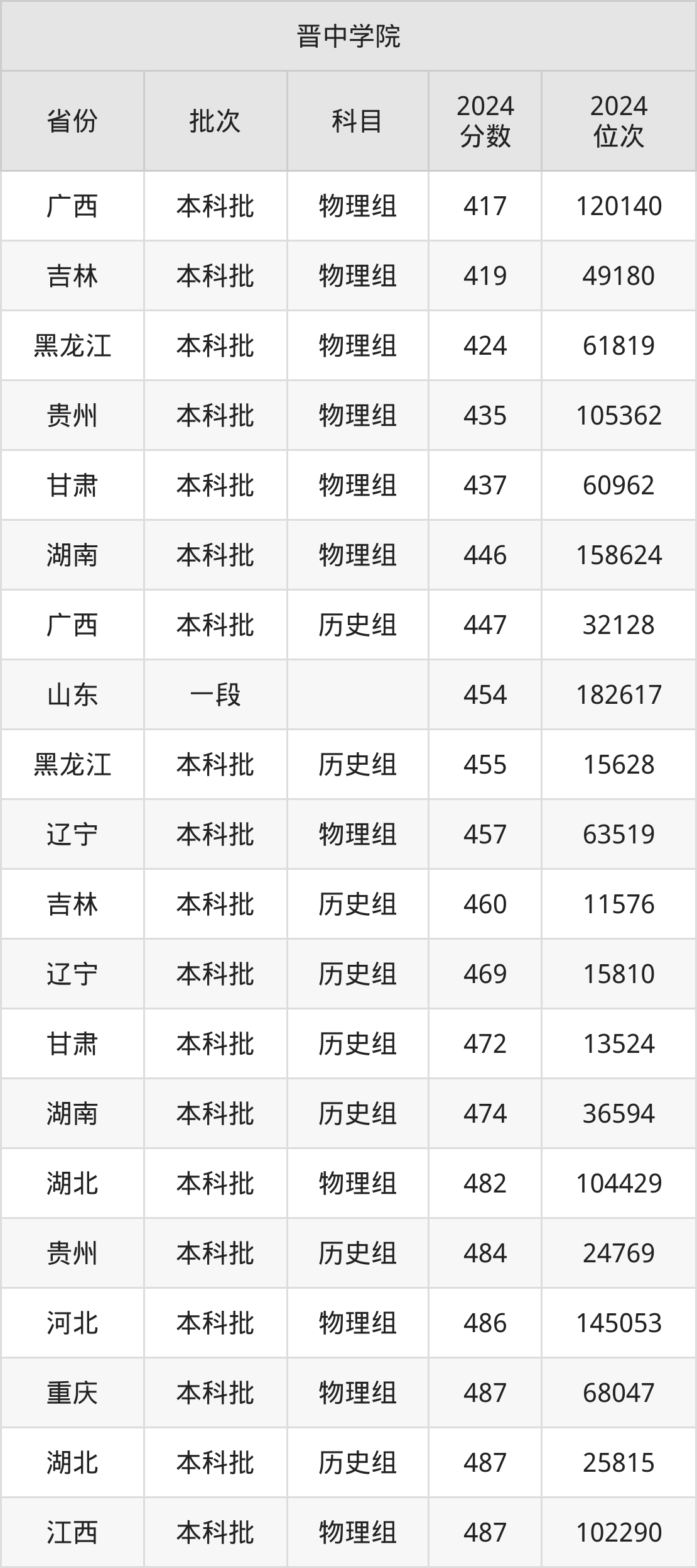 在广西本科批物理组,晋中学院的最低分是417、最低录取位次是120140名。在吉林本科批物理组,晋中学院的最低分是419、最低录取位次是49180名。