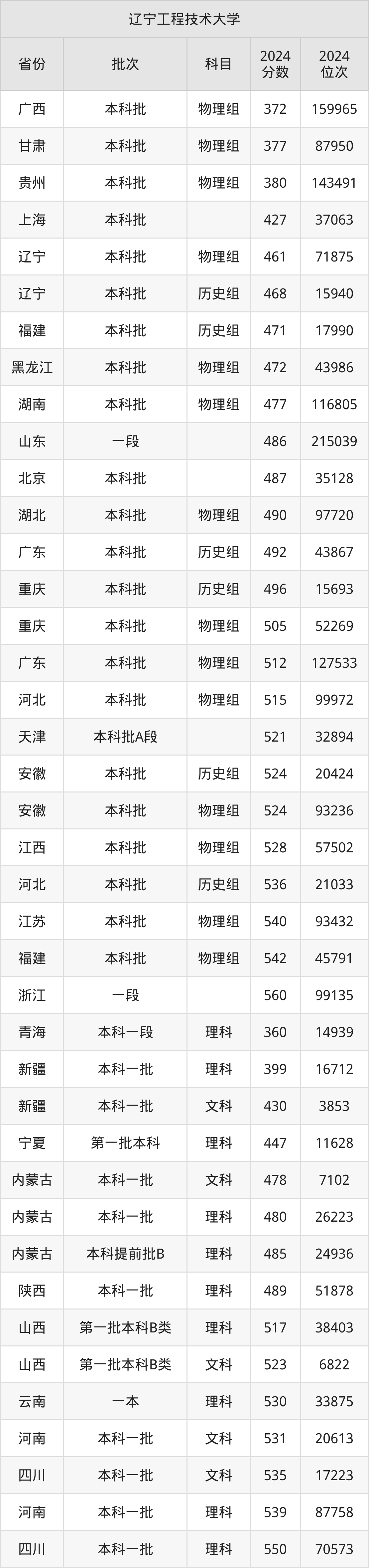 二、辽宁工程技术大学2024年录取分数线汇总