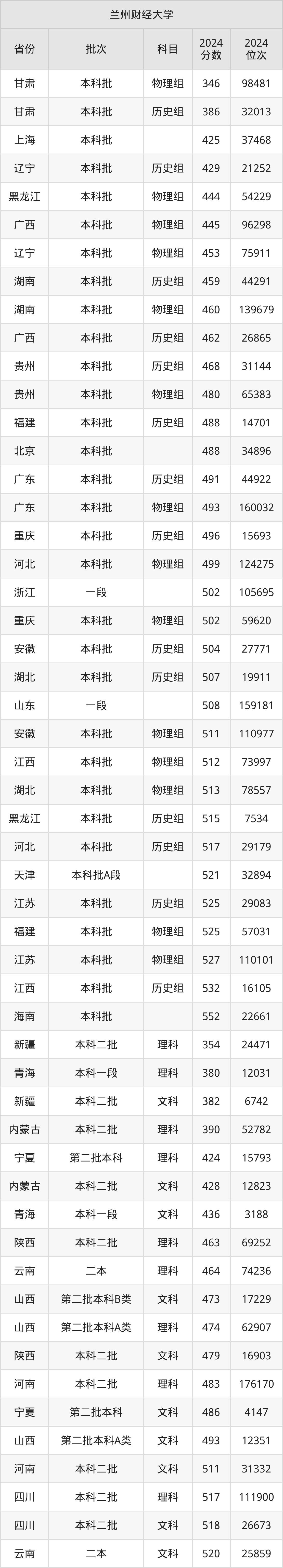 在甘肃本科批物理组,兰州财经大学的最低分是346、最低录取位次是98481名。在上海本科批,兰州财经大学的最低分是425、最低录取位次是37468名。