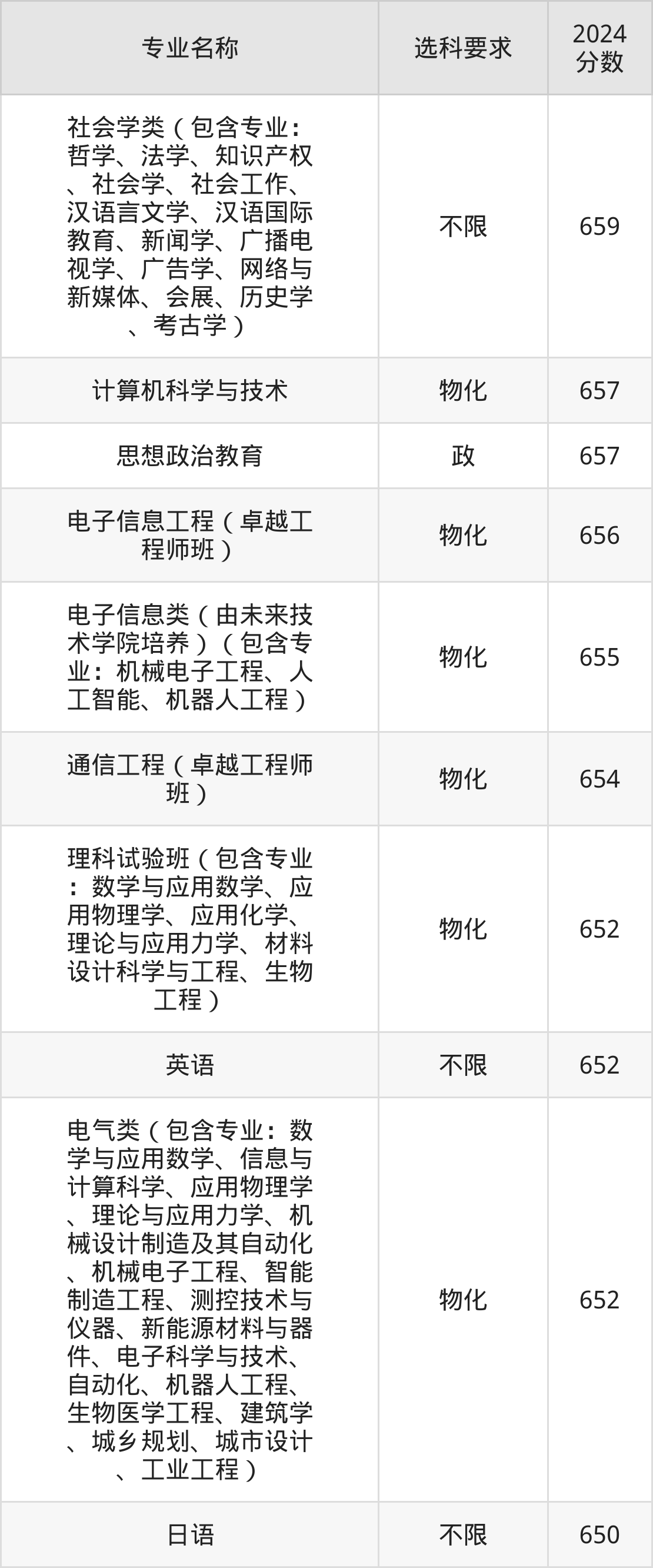 | 电子信息类(包含专业 :电子信息工程、通信 工程、微电子科学与工 程、光电信息科学与工 程、电子信息科学与技 术、人工智能、计算机 科学与技术、数字媒体 技术、智能科学与技术 、数据科学与大数据技 术、网络空间安全、电 影制作) | 物化 | 619 |