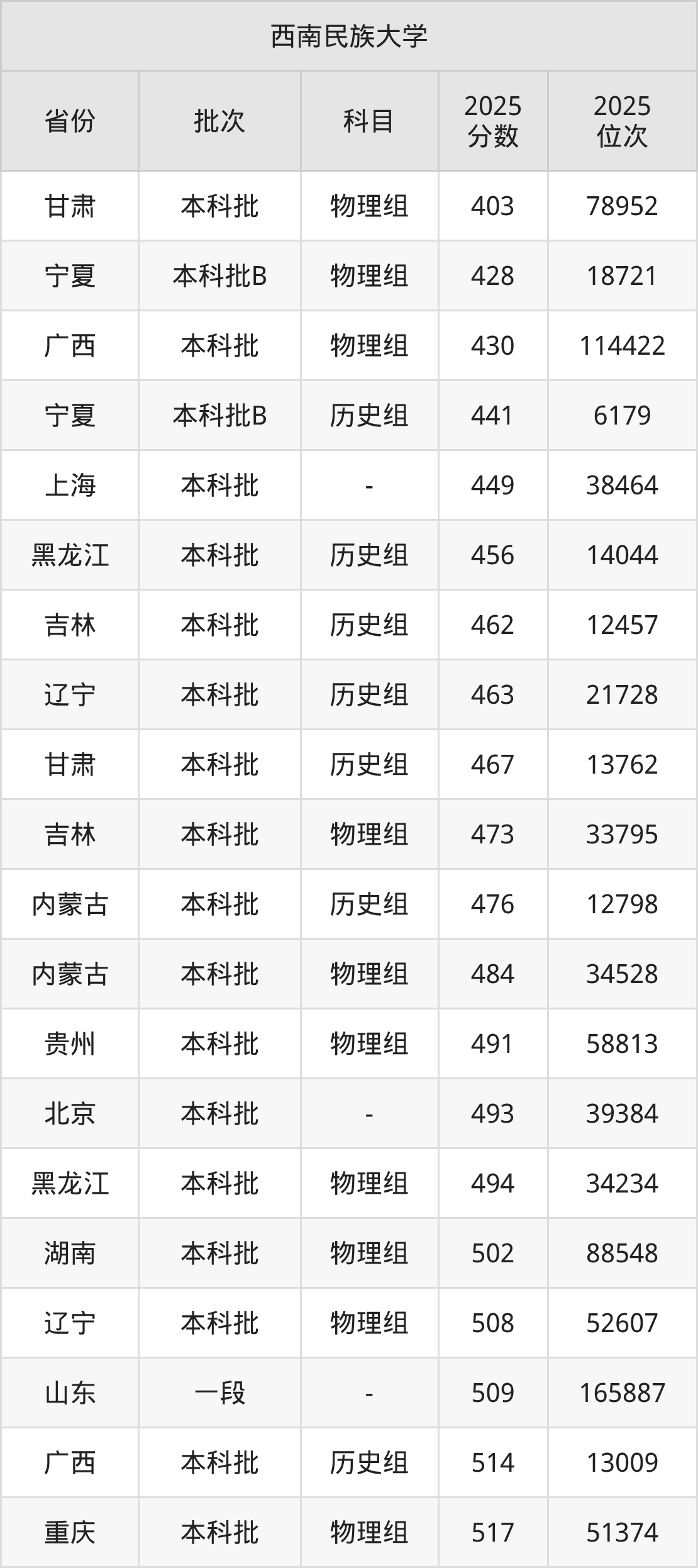 在甘肃本科批物理组,西南民族大学的最低分是403、最低录取位次是78952名。在宁夏本科批B物理组,西南民族大学的最低分是428、最低录取位次是18721名。