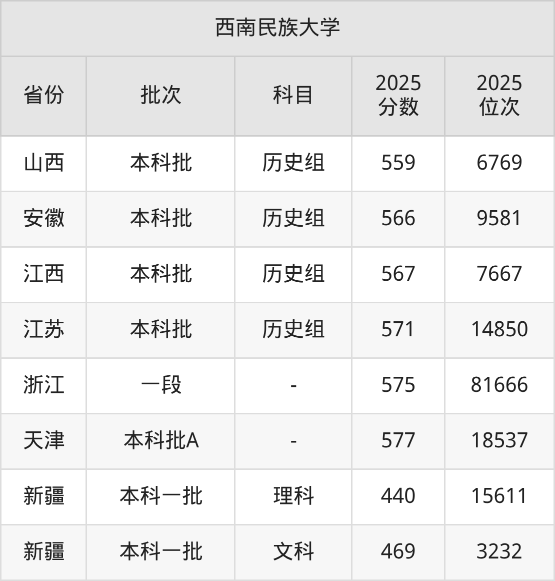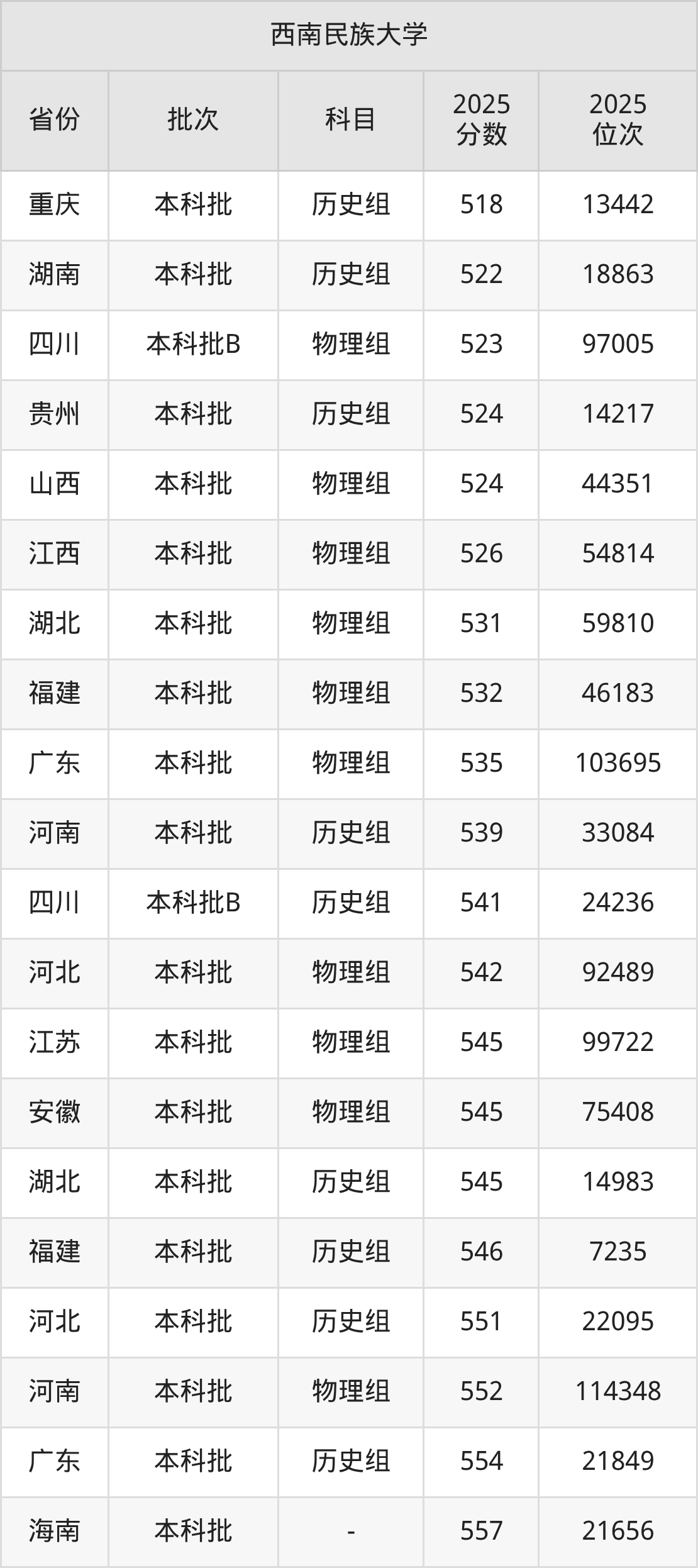 二、西南民族大学2025年录取分数线汇总