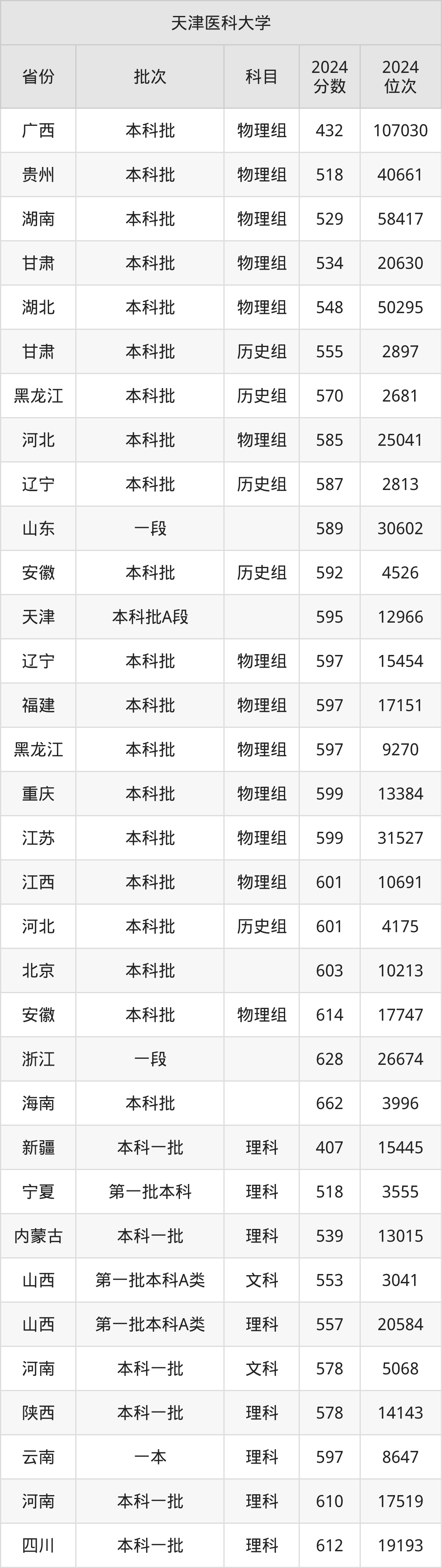在广西本科批物理组,天津医科大学的最低分是432、最低录取位次是107030名。在贵州本科批物理组,天津医科大学的最低分是518、最低录取位次是40661名。