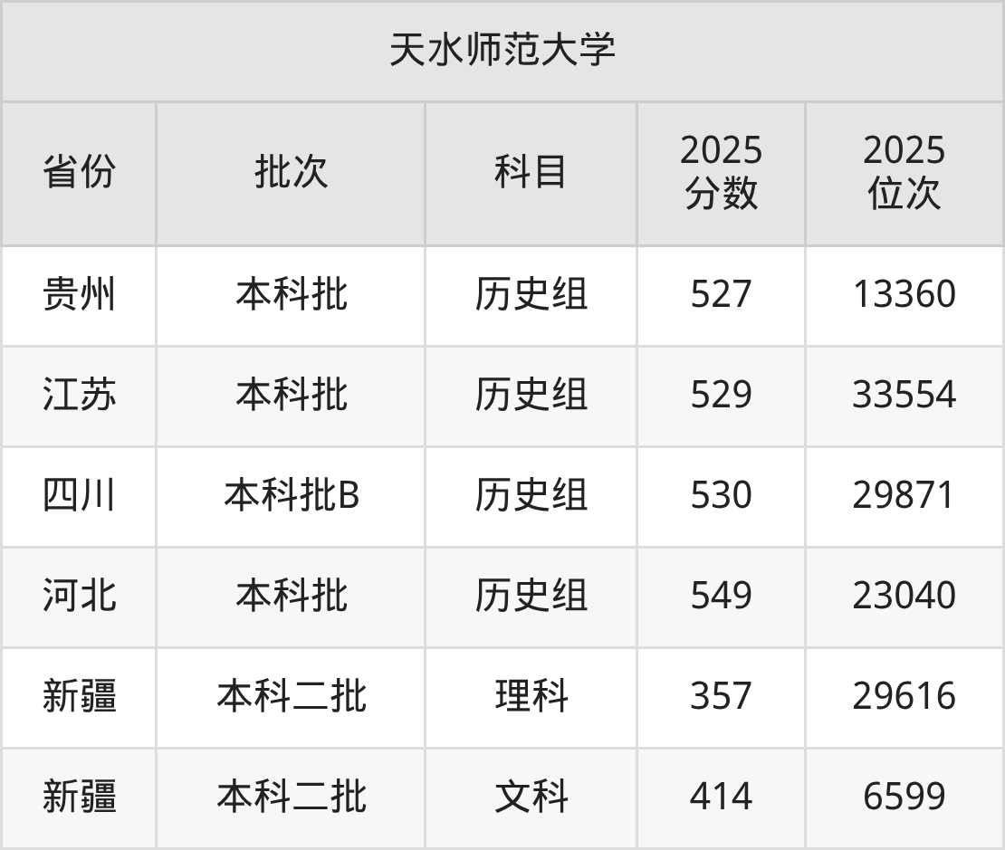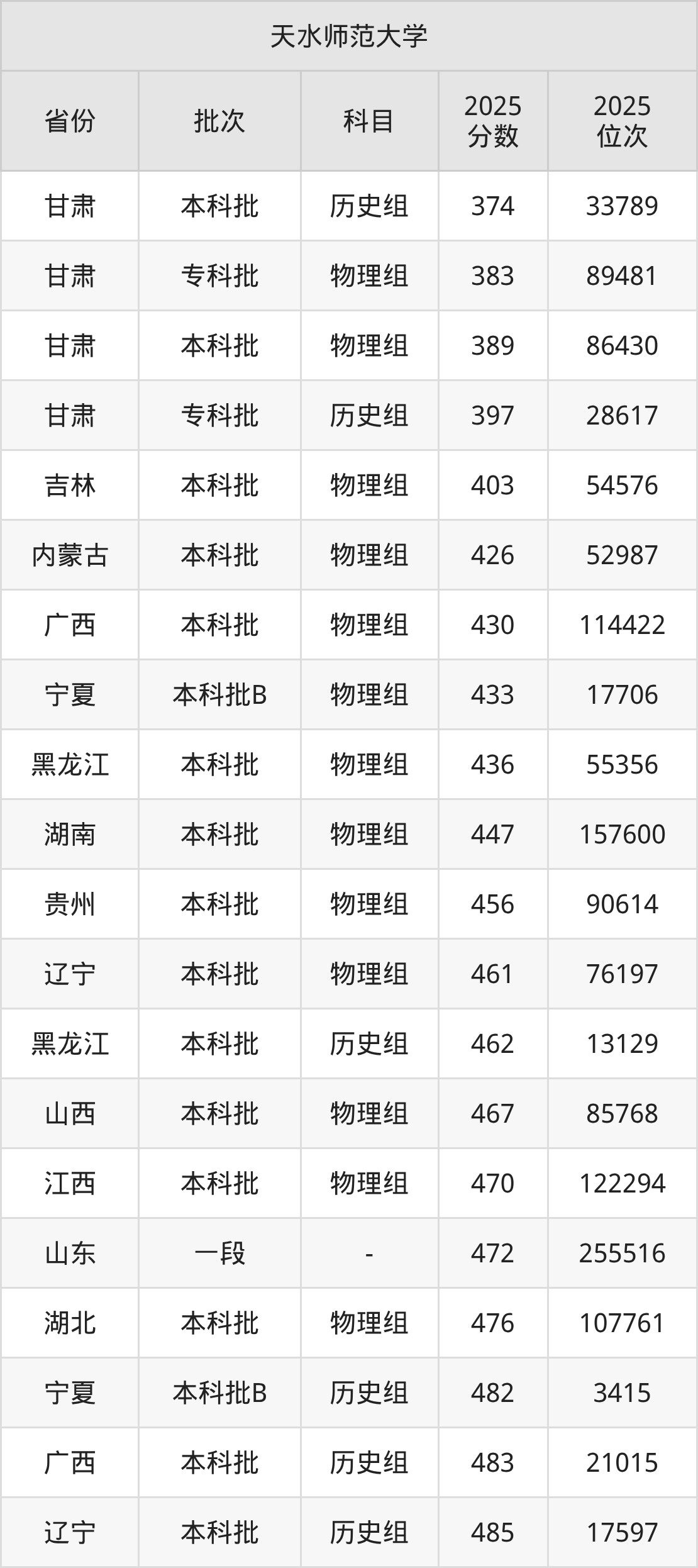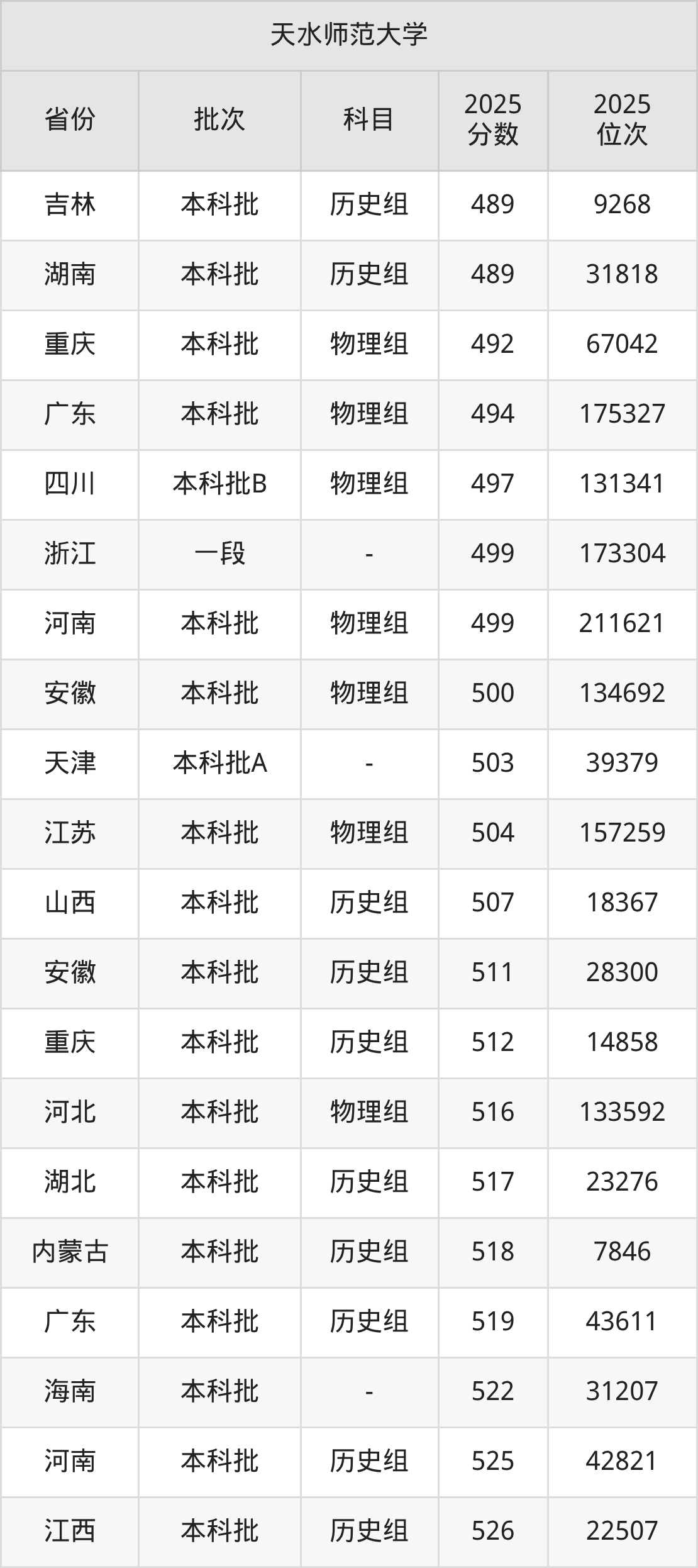 圆梦小编为2026届想要报考天水师范大学的同学整理了:天水师范大学2025年在全国24个省的最低分及录取位次。