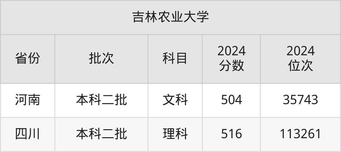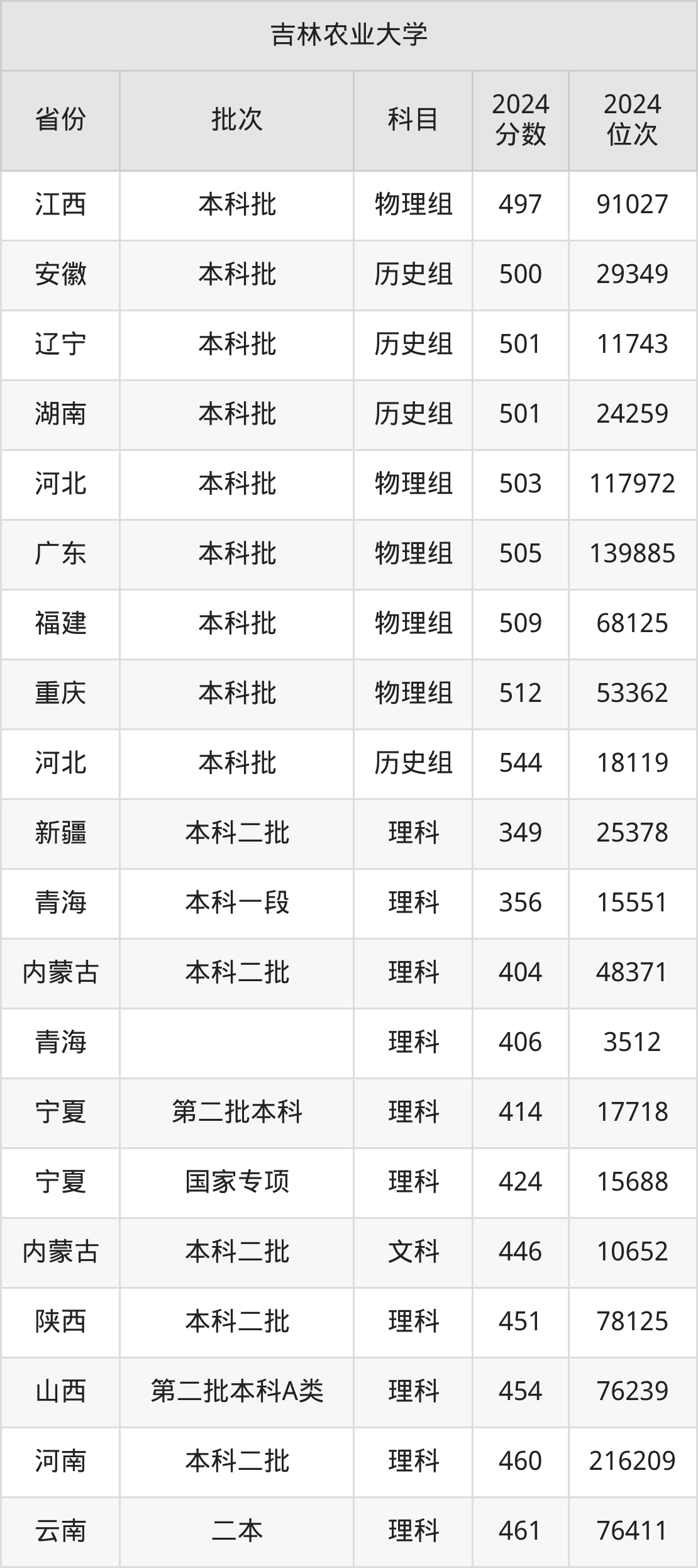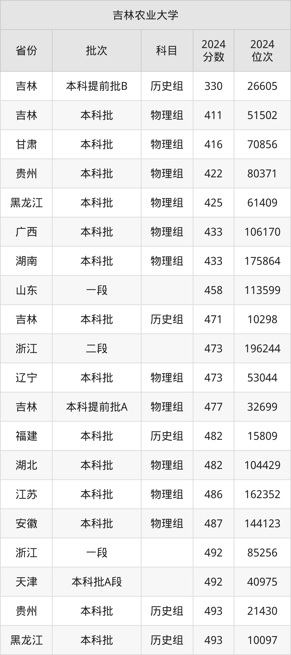在吉林本科提前批B历史组,吉林农业大学的最低分是330、最低录取位次是26605名。在甘肃本科批物理组,吉林农业大学的最低分是416、最低录取位次是70856名。