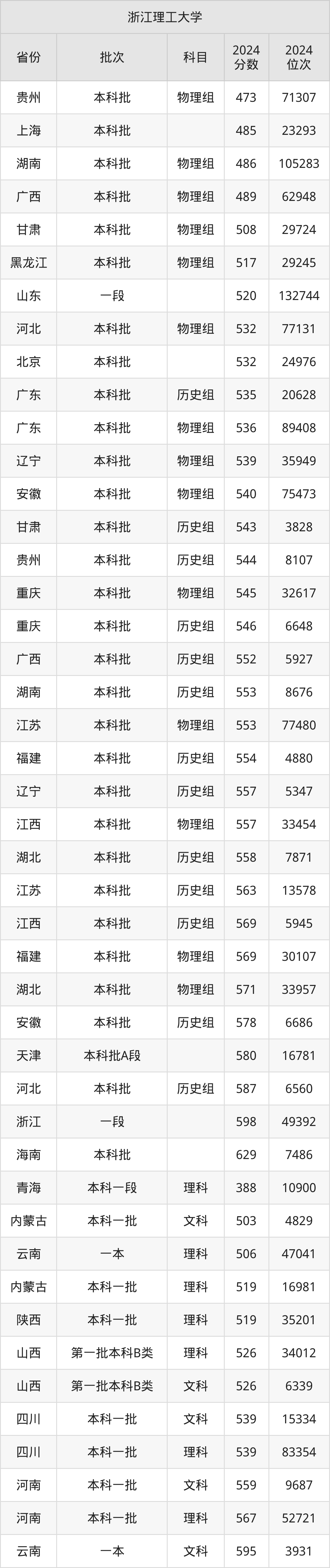 在贵州本科批物理组,浙江理工大学的最低分是473、最低录取位次是71307名。在上海本科批,浙江理工大学的最低分是485、最低录取位次是23293名。