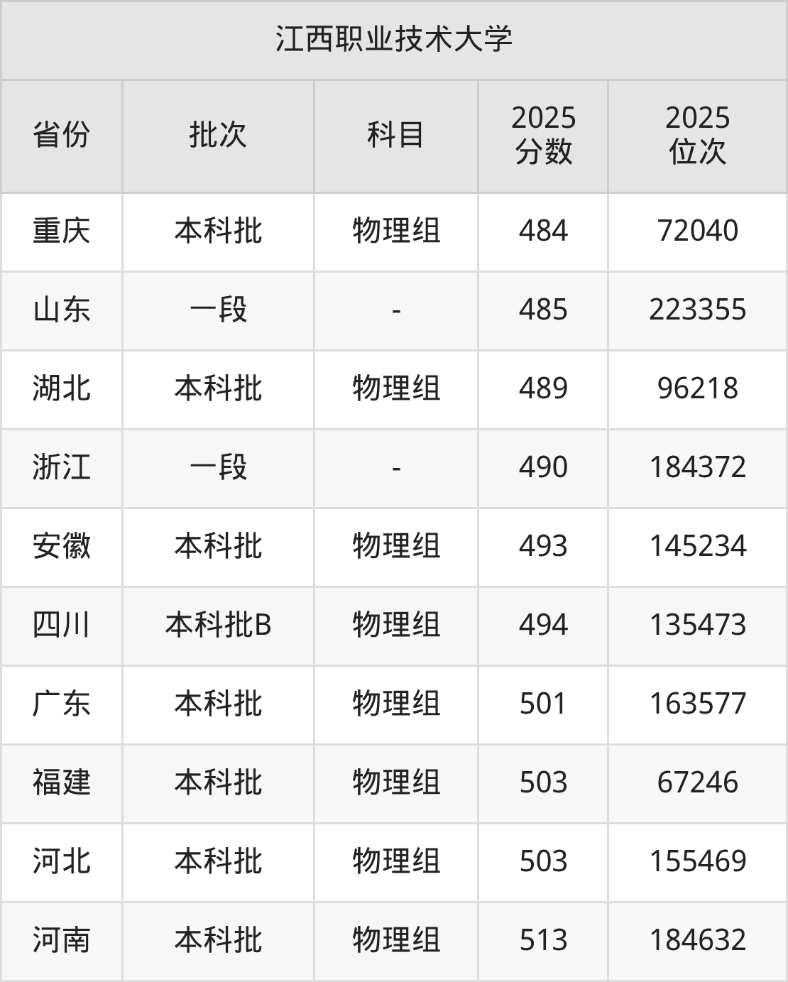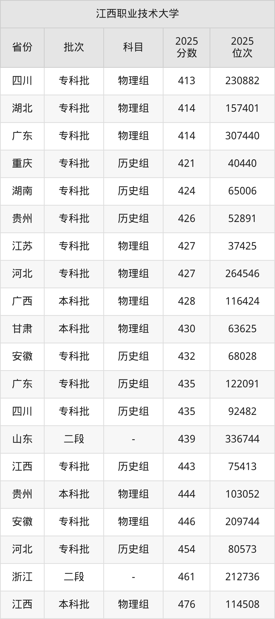 圆梦小编为2026届想要报考江西职业技术大学的同学整理了:江西职业技术大学2025年在全国21个省的最低分及录取位次。