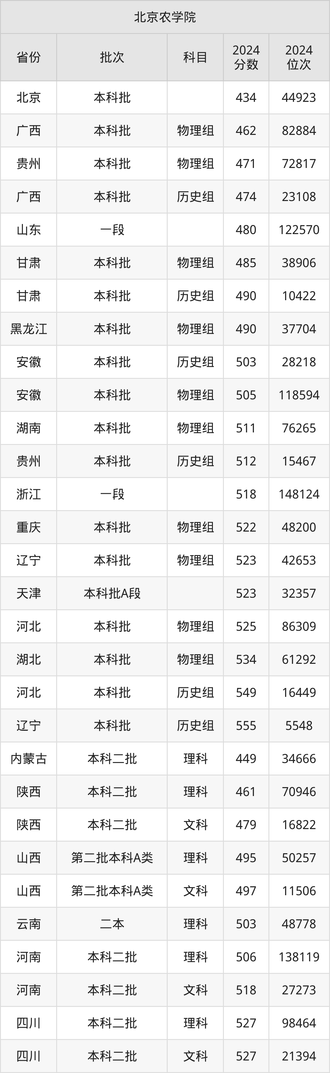 在北京本科批,北京农学院的最低分是434、最低录取位次是44923名。在广西本科批物理组,北京农学院的最低分是462、最低录取位次是82884名。