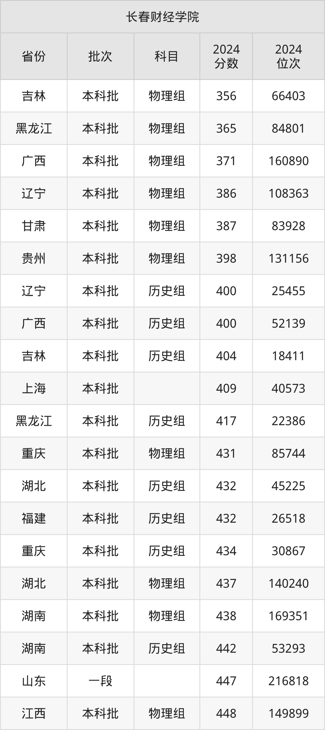 在吉林本科批物理组,长春财经学院的最低分是356、最低录取位次是66403名。在黑龙江本科批物理组,长春财经学院的最低分是365、最低录取位次是84801名。