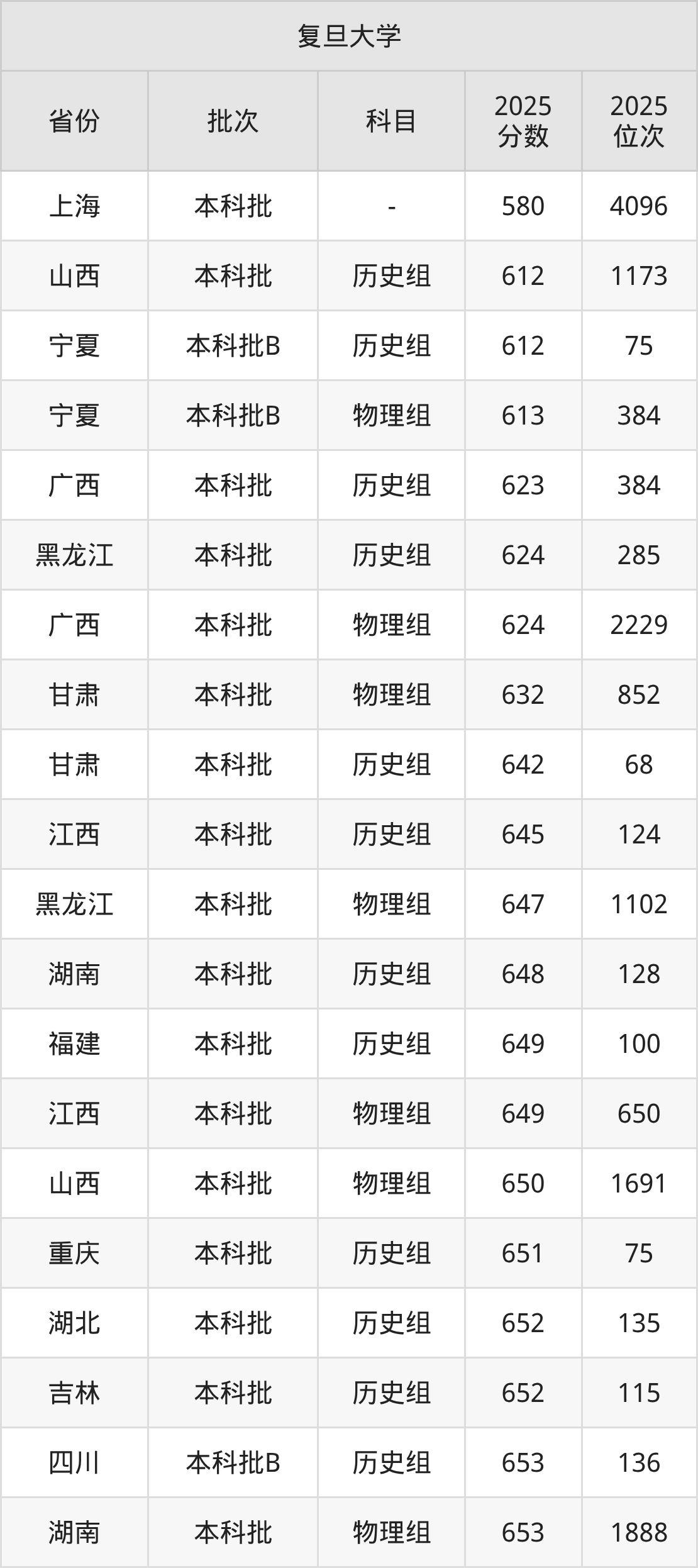 在上海本科批,复旦大学的最低分是580、最低录取位次是4096名。在山西本科批历史组,复旦大学的最低分是612、最低录取位次是1173名。