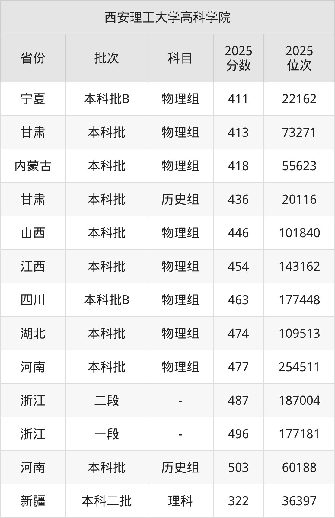 圆梦小编为2026届想要报考西安理工大学高科学院的同学整理了:西安理工大学高科学院2025年在全国10个省的最低分及录取位次。