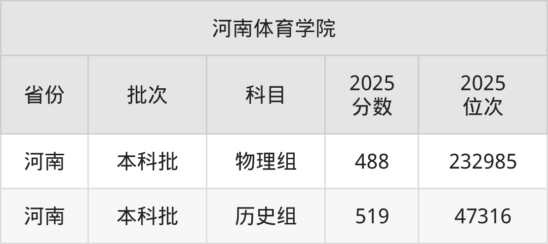 圆梦小编为2026届想要报考河南体育学院的同学整理了:河南体育学院2025年在全国1个省的最低分及录取位次。