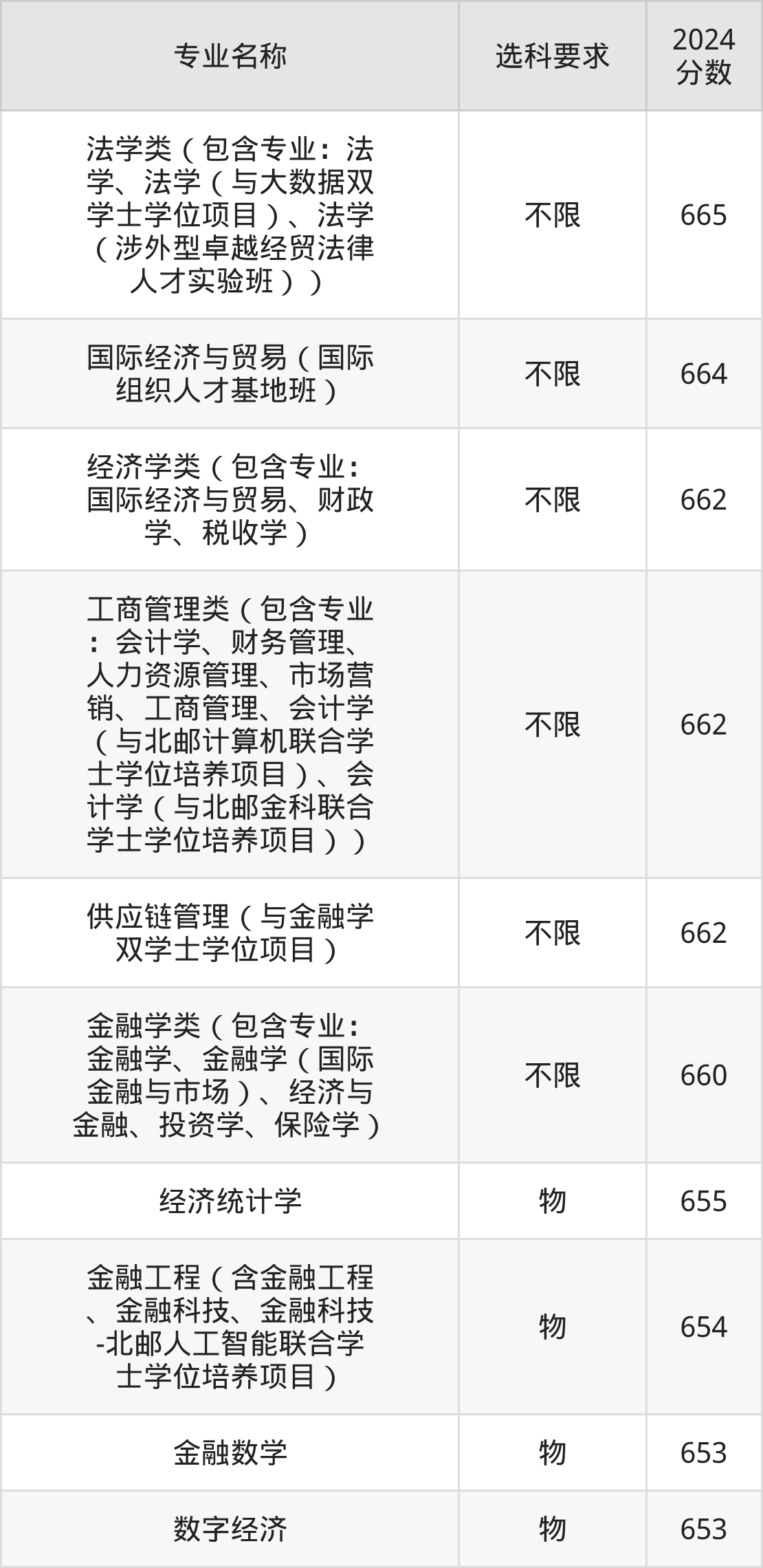 | 法学类(包含专业:法 学、法学(与大数据双 学士学位项目)、法学 (涉外型卓越经贸法律 人才实验班)) | 不限 | 641 |