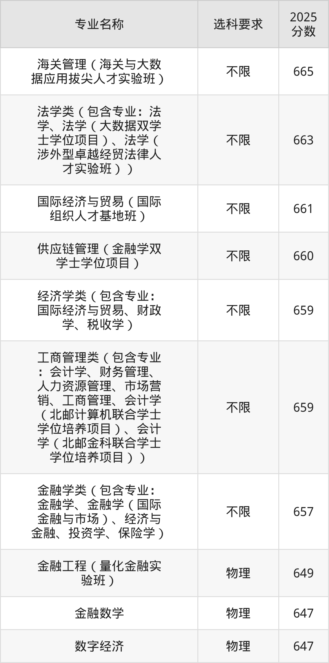 | 工商管理类(包含专业 :会计学、财务管理、 人力资源管理、市场营 销、工商管理、会计学 (北邮计算机联合学士 学位培养项目)、会计 学(北邮金科联合学士 学位培养项目)) | 不限 | 630 |