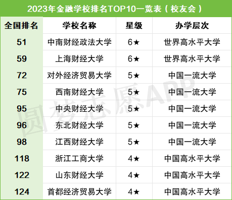 在2023年校友会大学排名中,排名十大的金融大学分别是: