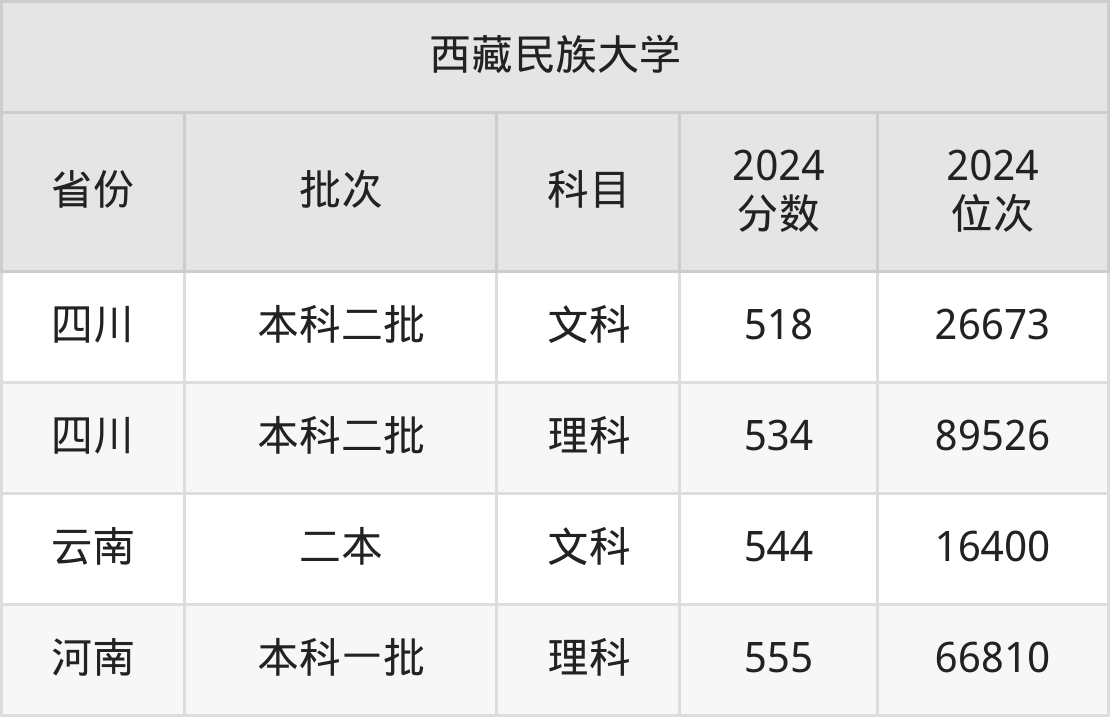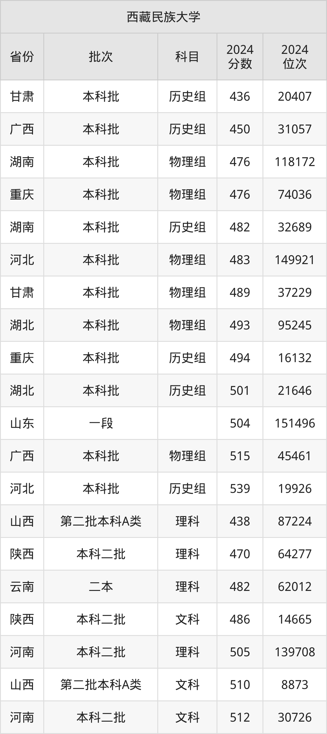 圆梦小编为2025届想要报考西藏民族大学的同学整理了:西藏民族大学2024年在全国12个省的最低分及录取位次。